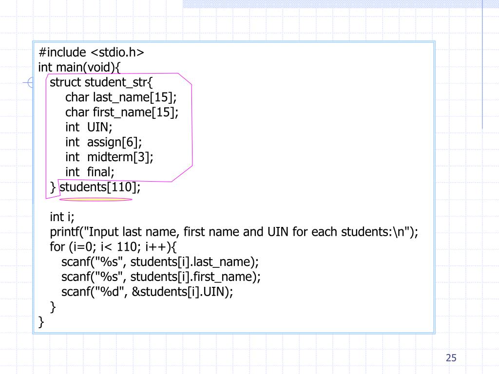 #include <stdio.h> int main(void){ struct student_str{ char last_name[15]; char first_name[15]; int UIN; int assign[6]; int midterm[3]; int final; } students[110]; int i; printf("Input last name, first name and UIN for each students:\n"); for (i=0; i< 110; i++){ scanf("%s", students[i].last_name); scanf("%s", students[i].first_name); scanf("%d", &students[i].UIN); } }
