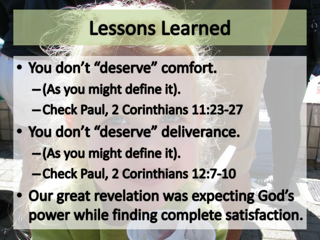 Lessons Learned • You don’t “deserve” comfort. • (As you might define it). • Check Paul, 2 Corinthians 11:23-27 • You don’t “deserve” deliverance. • (As you might define it). • Check Paul, 2 Corinthians 12:7-10 • Our great revelation was expecting God’s power while finding complete satisfaction.