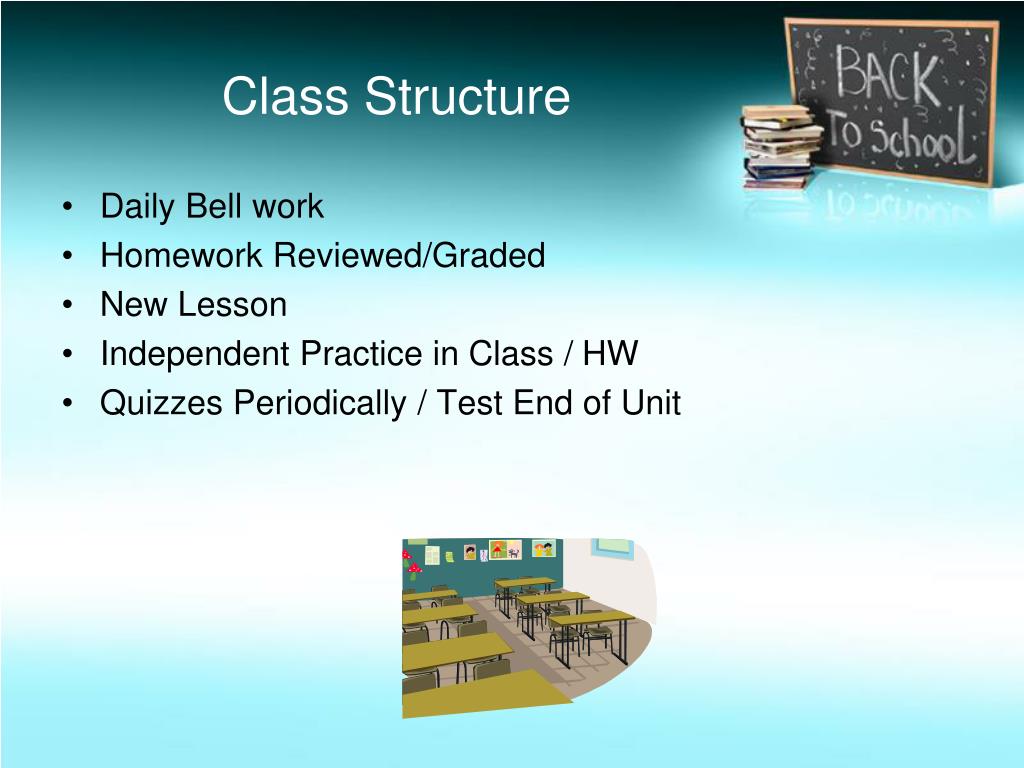 Class Structure • Daily Bell work • Homework Reviewed/Graded • New Lesson • Independent Practice in Class / HW • Quizzes Periodically / Test End of Unit