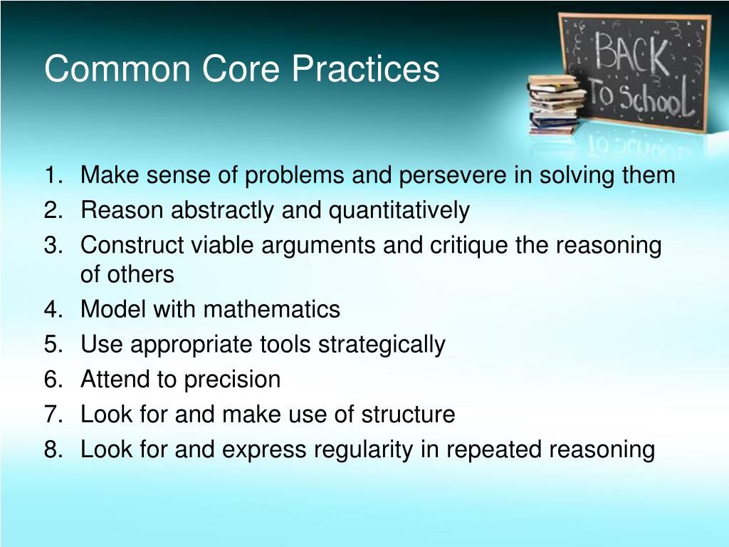 Common Core Practices • Make sense of problems and persevere in solving them • Reason abstractly and quantitatively • Construct viable arguments and critique the reasoning of others • Model with mathematics • Use appropriate tools strategically • Attend to precision • Look for and make use of structure • Look for and express regularity in repeated reasoning