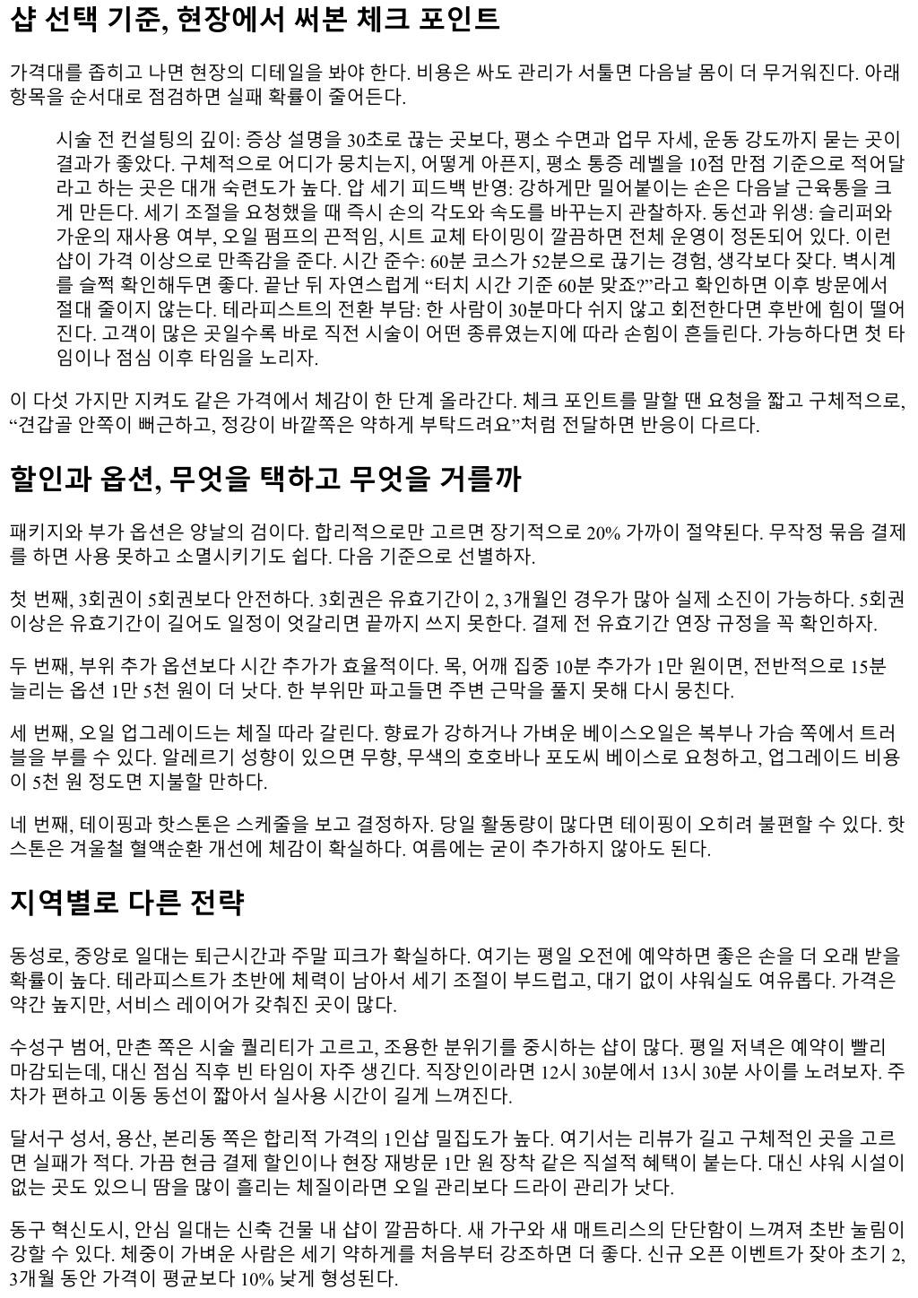 샵선택기준, 현장에서써본체크포인트 가격대를좁히고나면현장의디테일을봐야한다. 비용은싸도관리가서툴면다음날몸이더무거워진다. 아래 항목을순서대로점검하면실패확률이줄어든다. 시술전컨설팅의깊이: 증상설명을 30초로끊는곳보다, 평소수면과업무자세, 운동강도까지묻는곳이 결과가좋았다. 구체적으로어디가뭉치는지, 어떻게아픈지, 평소통증레벨을 10점만점기준으로적어달 라고하는곳은대개숙련도가높다. 압세기피드백반영: 강하게만밀어붙이는손은다음날근육통을크 게만든다. 세기조절을요청했을때즉시손의각도와속도를바꾸는지관찰하자. 동선과위생: 슬리퍼와 가운의재사용여부, 오일펌프의끈적임, 시트교체타이밍이깔끔하면전체운영이정돈되어있다. 이런 샵이가격이상으로만족감을준다. 시간준수: 60분코스가 52분으로끊기는경험, 생각보다잦다. 벽시계 를슬쩍확인해두면좋다. 끝난뒤자연스럽게 “터치시간기준 60분맞죠?”라고확인하면이후방문에서 절대줄이지않는다. 테라피스트의전환부담: 한사람이 30분마다쉬지않고회전한다면후반에힘이떨어 진다. 고객이많은곳일수록바로직전시술이어떤종류였는지에따라손힘이흔들린다. 가능하다면첫타 임이나점심이후타임을노리자. 이다섯가지만지켜도같은가격에서체감이한단계올라간다. 체크포인트를말할땐요청을짧고구체적으로, “견갑골안쪽이뻐근하고, 정강이바깥쪽은약하게부탁드려요”처럼전달하면반응이다르다. 할인과옵션, 무엇을택하고무엇을거를까 패키지와부가옵션은양날의검이다. 합리적으로만고르면장기적으로 20% 가까이절약된다. 무작정묶음결제 를하면사용못하고소멸시키기도쉽다. 다음기준으로선별하자. 첫번째, 3회권이 5회권보다안전하다. 3회권은유효기간이 2, 3개월인경우가많아실제소진이가능하다. 5회권 이상은유효기간이길어도일정이엇갈리면끝까지쓰지못한다. 결제전유효기간연장규정을꼭확인하자. 두번째, 부위추가옵션보다시간추가가효율적이다. 목, 어깨집중 10분추가가 1만원이면, 전반적으로 15분 늘리는옵션 1만 5천원이더낫다. 한부위만파고들면주변근막을풀지못해다시뭉친다. 세번째, 오일업그레이드는체질따라갈린다. 향료가강하거나가벼운베이스오일은복부나가슴쪽에서트러 블을부를수있다. 알레르기성향이있으면무향, 무색의호호바나포도씨베이스로요청하고, 업그레이드비용 이 5천원정도면지불할만하다. 네번째, 테이핑과핫스톤은스케줄을보고결정하자. 당일활동량이많다면테이핑이오히려불편할수있다. 핫 스톤은겨울철혈액순환개선에체감이확실하다. 여름에는굳이추가하지않아도된다. 지역별로다른전략 동성로, 중앙로일대는퇴근시간과주말피크가확실하다. 여기는평일오전에예약하면좋은손을더오래받을 확률이높다. 테라피스트가초반에체력이남아서세기조절이부드럽고, 대기없이샤워실도여유롭다. 가격은 약간높지만, 서비스레이어가갖춰진곳이많다. 수성구범어, 만촌쪽은시술퀄리티가고르고, 조용한분위기를중시하는샵이많다. 평일저녁은예약이빨리 마감되는데, 대신점심직후빈타임이자주생긴다. 직장인이라면 12시 30분에서 13시 30분사이를노려보자. 주 차가편하고이동동선이짧아서실사용시간이길게느껴진다. 달서구성서, 용산, 본리동쪽은합리적가격의 1인샵밀집도가높다. 여기서는리뷰가길고구체적인곳을고르 면실패가적다. 가끔현금결제할인이나현장재방문 1만원장착같은직설적혜택이붙는다. 대신샤워시설이 없는곳도있으니땀을많이흘리는체질이라면오일관리보다드라이관리가낫다. 동구혁신도시, 안심일대는신축건물내샵이깔끔하다. 새가구와새매트리스의단단함이느껴져초반눌림이 강할수있다. 체중이가벼운사람은세기약하게를처음부터강조하면더좋다. 신규오픈이벤트가잦아초기 2, 3개월동안가격이평균보다 10% 낮게형성된다.