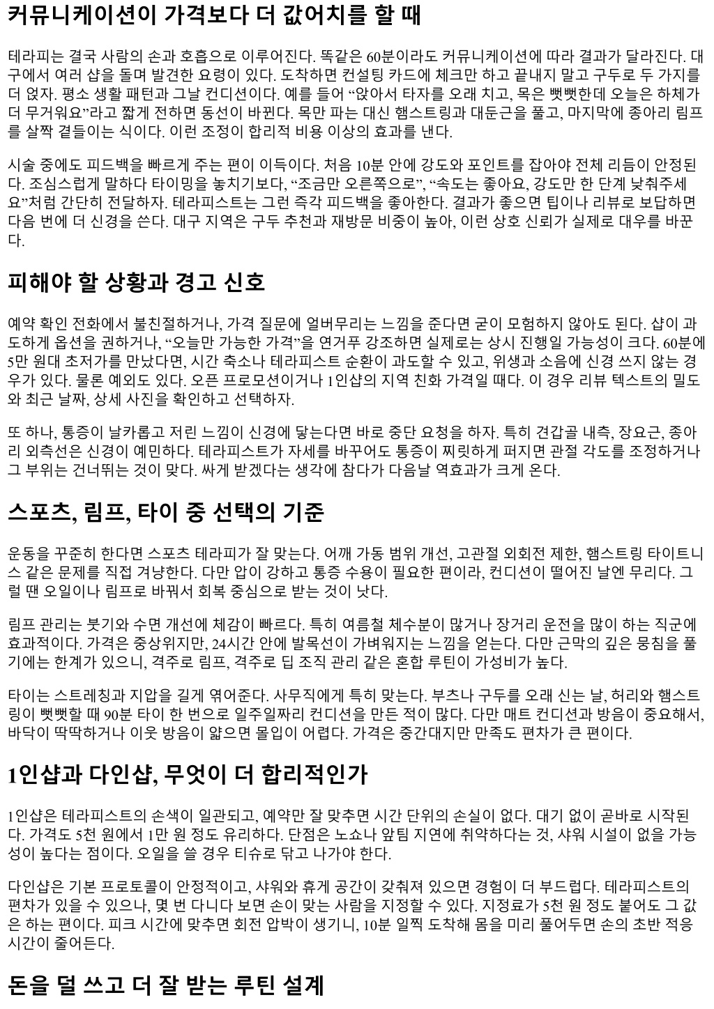 커뮤니케이션이가격보다더값어치를할때 테라피는결국사람의손과호흡으로이루어진다. 똑같은 60분이라도커뮤니케이션에따라결과가달라진다. 대 구에서여러샵을돌며발견한요령이있다. 도착하면컨설팅카드에체크만하고끝내지말고구두로두가지를 더얹자. 평소생활패턴과그날컨디션이다. 예를들어 “앉아서타자를오래치고, 목은뻣뻣한데오늘은하체가 더무거워요”라고짧게전하면동선이바뀐다. 목만파는대신햄스트링과대둔근을풀고, 마지막에종아리림프 를살짝곁들이는식이다. 이런조정이합리적비용이상의효과를낸다. 시술중에도피드백을빠르게주는편이이득이다. 처음 10분안에강도와포인트를잡아야전체리듬이안정된 다. 조심스럽게말하다타이밍을놓치기보다, “조금만오른쪽으로”, “속도는좋아요, 강도만한단계낮춰주세 요”처럼간단히전달하자. 테라피스트는그런즉각피드백을좋아한다. 결과가좋으면팁이나리뷰로보답하면 다음번에더신경을쓴다. 대구지역은구두추천과재방문비중이높아, 이런상호신뢰가실제로대우를바꾼 다. 피해야할상황과경고신호 예약확인전화에서불친절하거나, 가격질문에얼버무리는느낌을준다면굳이모험하지않아도된다. 샵이과 도하게옵션을권하거나, “오늘만가능한가격”을연거푸강조하면실제로는상시진행일가능성이크다. 60분에 5만원대초저가를만났다면, 시간축소나테라피스트순환이과도할수있고, 위생과소음에신경쓰지않는경 우가있다. 물론예외도있다. 오픈프로모션이거나 1인샵의지역친화가격일때다. 이경우리뷰텍스트의밀도 와최근날짜, 상세사진을확인하고선택하자. 또하나, 통증이날카롭고저린느낌이신경에닿는다면바로중단요청을하자. 특히견갑골내측, 장요근, 종아 리외측선은신경이예민하다. 테라피스트가자세를바꾸어도통증이찌릿하게퍼지면관절각도를조정하거나 그부위는건너뛰는것이맞다. 싸게받겠다는생각에참다가다음날역효과가크게온다. 스포츠, 림프, 타이중선택의기준 운동을꾸준히한다면스포츠테라피가잘맞는다. 어깨가동범위개선, 고관절외회전제한, 햄스트링타이트니 스같은문제를직접겨냥한다. 다만압이강하고통증수용이필요한편이라, 컨디션이떨어진날엔무리다. 그 럴땐오일이나림프로바꿔서회복중심으로받는것이낫다. 림프관리는붓기와수면개선에체감이빠르다. 특히여름철체수분이많거나장거리운전을많이하는직군에 효과적이다. 가격은중상위지만, 24시간안에발목선이가벼워지는느낌을얻는다. 다만근막의깊은뭉침을풀 기에는한계가있으니, 격주로림프, 격주로딥조직관리같은혼합루틴이가성비가높다. 타이는스트레칭과지압을길게엮어준다. 사무직에게특히맞는다. 부츠나구두를오래신는날, 허리와햄스트 링이뻣뻣할때 90분타이한번으로일주일짜리컨디션을만든적이많다. 다만매트컨디션과방음이중요해서, 바닥이딱딱하거나이웃방음이얇으면몰입이어렵다. 가격은중간대지만만족도편차가큰편이다. 1인샵과다인샵, 무엇이더합리적인가 1인샵은테라피스트의손색이일관되고, 예약만잘맞추면시간단위의손실이없다. 대기없이곧바로시작된 다. 가격도 5천원에서 1만원정도유리하다. 단점은노쇼나앞팀지연에취약하다는것, 샤워시설이없을가능 성이높다는점이다. 오일을쓸경우티슈로닦고나가야한다. 다인샵은기본프로토콜이안정적이고, 샤워와휴게공간이갖춰져있으면경험이더부드럽다. 테라피스트의 편차가있을수있으나, 몇번다니다보면손이맞는사람을지정할수있다. 지정료가 5천원정도붙어도그값 은하는편이다. 피크시간에맞추면회전압박이생기니, 10분일찍도착해몸을미리풀어두면손의초반적응 시간이줄어든다. 돈을덜쓰고더잘받는루틴설계