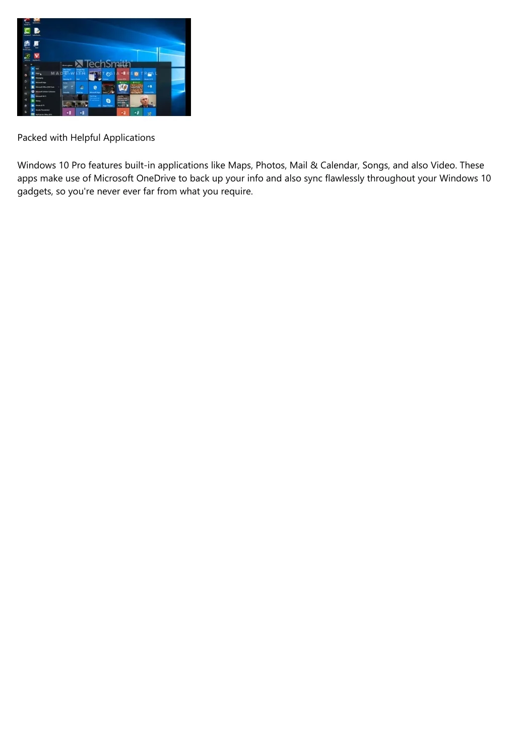 Packed with Helpful Applications Windows 10 Pro features built-in applications like Maps, Photos, Mail & Calendar, Songs, and also Video. These apps make use of Microsoft OneDrive to back up your info and also sync flawlessly throughout your Windows 10 gadgets, so you're never ever far from what you require.