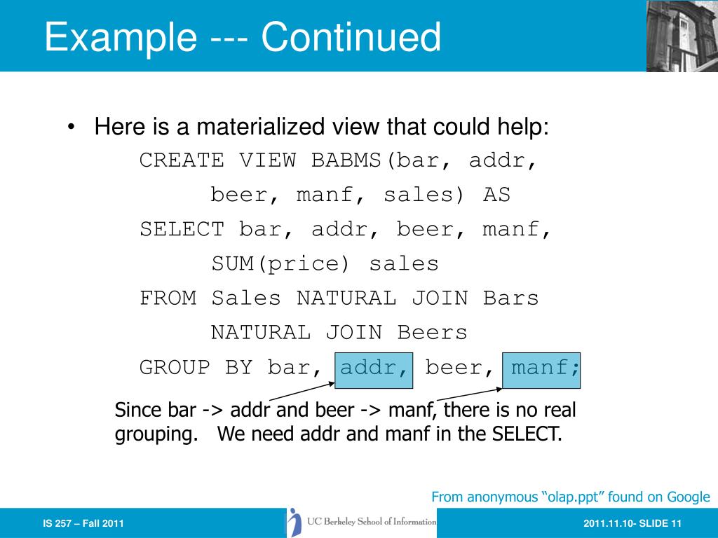 Example --- Continued Since bar -> addr and beer -> manf, there is no real grouping. We need addr and manf in the SELECT. • Here is a materialized view that could help: CREATE VIEW BABMS(bar, addr, beer, manf, sales) AS SELECT bar, addr, beer, manf, SUM(price) sales FROM Sales NATURAL JOIN Bars NATURAL JOIN Beers GROUP BY bar, addr, beer, manf; From anonymous “olap.ppt” found on Google