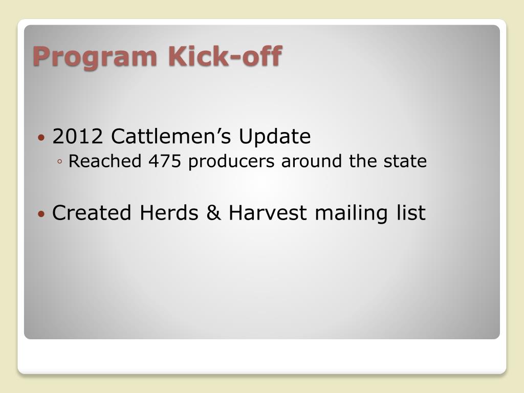 2012 Cattlemen’s Update • Reached 475 producers around the state • Created Herds & Harvest mailing list Program Kick-off
