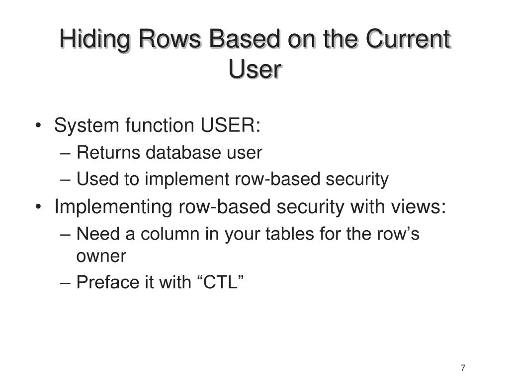 Hiding Rows Based on the Current User • System function USER: • Returns database user • Used to implement row-based security • Implementing row-based security with views: • Need a column in your tables for the row’s owner • Preface it with “CTL”