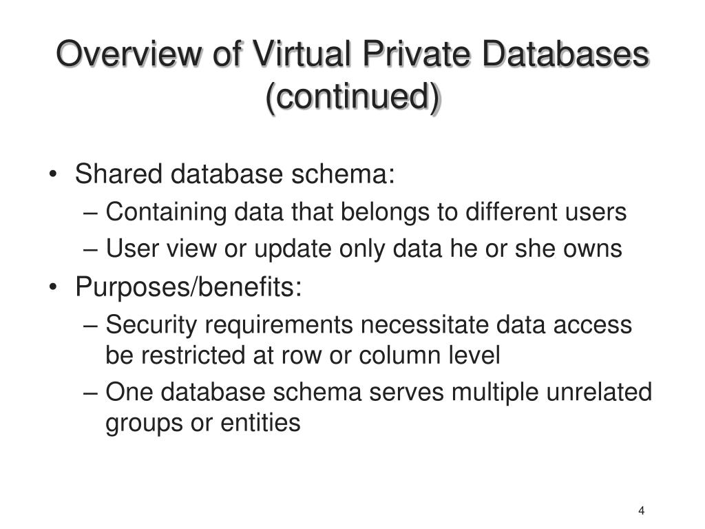 Overview of Virtual Private Databases (continued) • Shared database schema: • Containing data that belongs to different users • User view or update only data he or she owns • Purposes/benefits: • Security requirements necessitate data access be restricted at row or column level • One database schema serves multiple unrelated groups or entities