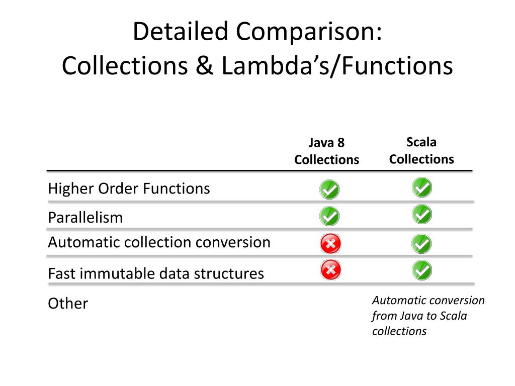 Detailed Comparison: Collections & Lambda’s/Functions Scala Collections Java 8 Collections Higher Order Functions Parallelism Automatic collection conversion Fast immutable data structures Other Automatic conversion from Java to Scala collections