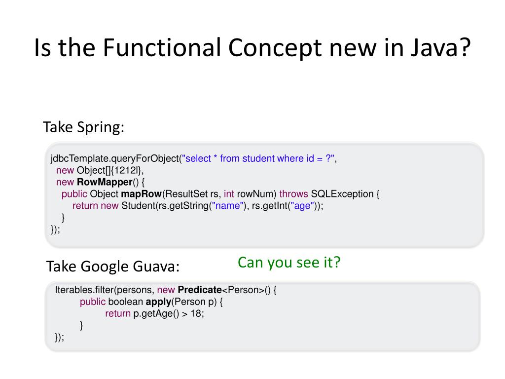 Is the Functional Concept new in Java? Take Spring: jdbcTemplate.queryForObject("select * from student where id = ?", new Object[]{1212l}, newRowMapper() { public Object mapRow(ResultSetrs, introwNum) throwsSQLException { returnnew Student(rs.getString("name"), rs.getInt("age")); } }); Can you see it? Take Google Guava: Iterables.filter(persons, newPredicate<Person>() { publicbooleanapply(Person p) { returnp.getAge() > 18; } });