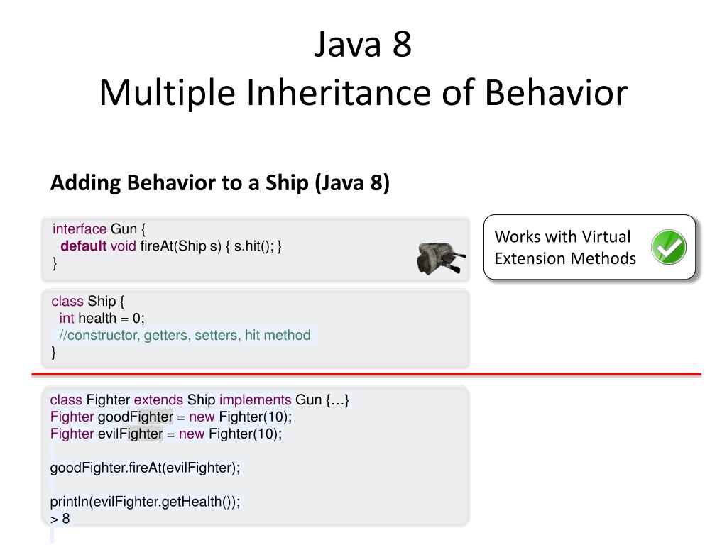 Java 8Multiple Inheritance of Behavior Adding Behavior to a Ship (Java 8) • Works with Virtual Extension Methods • interfaceGun { • default voidfireAt(Ship s) { s.hit(); } • } • classShip { • int health = 0; • //constructor, getters, setters, hit method • } class Fighter extends Ship implements Gun {…} FightergoodFighter= new Fighter(10); FighterevilFighter = newFighter(10); goodFighter.fireAt(evilFighter); println(evilFighter.getHealth()); > 8