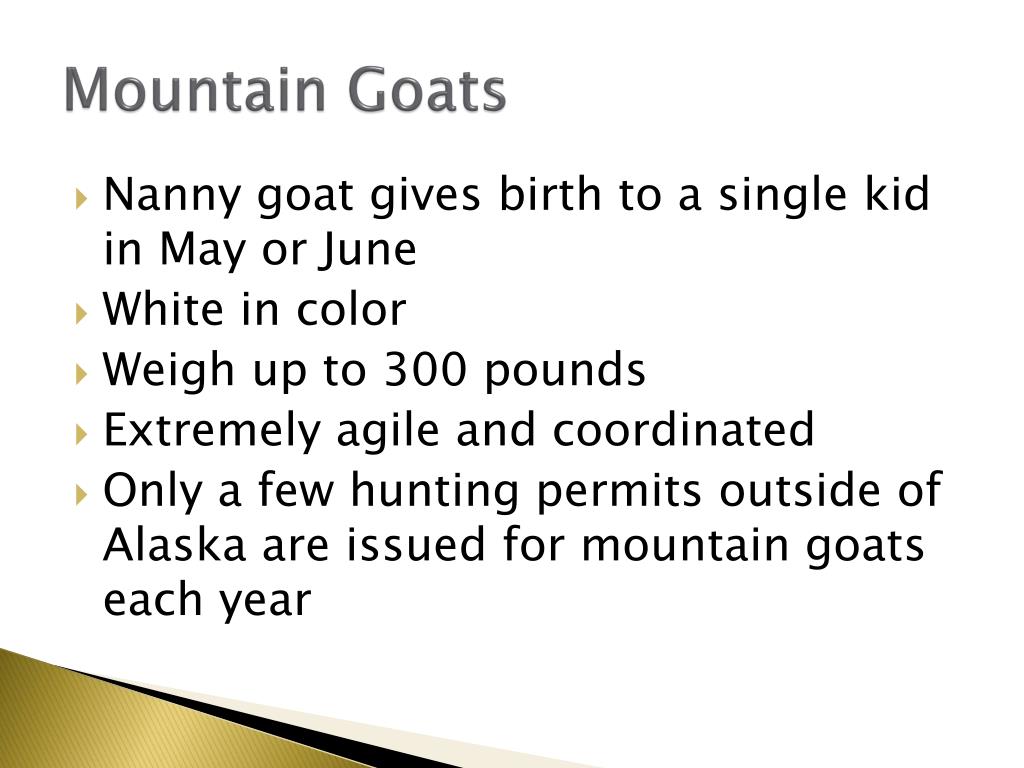 Mountain Goats • Nanny goat gives birth to a single kid in May or June • White in color • Weigh up to 300 pounds • Extremely agile and coordinated • Only a few hunting permits outside of Alaska are issued for mountain goats each year
