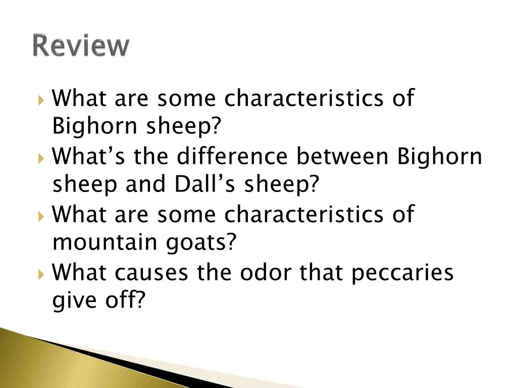 Review • What are some characteristics of Bighorn sheep? • What’s the difference between Bighorn sheep and Dall’s sheep? • What are some characteristics of mountain goats? • What causes the odor that peccaries give off?