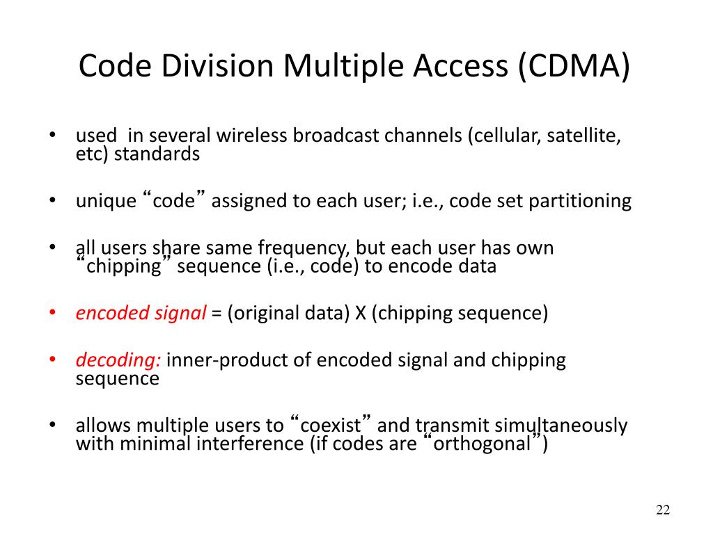 Code Division Multiple Access (CDMA) • used in several wireless broadcast channels (cellular, satellite, etc) standards • unique “code” assigned to each user; i.e., code set partitioning • all users share same frequency, but each user has own “chipping” sequence (i.e., code) to encode data • encoded signal = (original data) X (chipping sequence) • decoding: inner-product of encoded signal and chipping sequence • allows multiple users to “coexist” and transmit simultaneously with minimal interference (if codes are “orthogonal”)