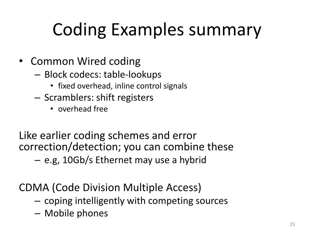 Coding Examples summary • Common Wired coding • Block codecs: table-lookups • fixed overhead, inline control signals • Scramblers: shift registers • overhead free Like earlier coding schemes and error correction/detection; you can combine these • e.g, 10Gb/s Ethernet may use a hybrid CDMA (Code Division Multiple Access) • coping intelligently with competing sources • Mobile phones