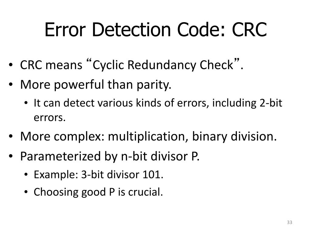 Error Detection Code: CRC • CRC means “Cyclic Redundancy Check”. • More powerful than parity. • It can detect various kinds of errors, including 2-bit errors. • More complex: multiplication, binary division. • Parameterized by n-bit divisor P. • Example: 3-bit divisor 101. • Choosing good P is crucial.