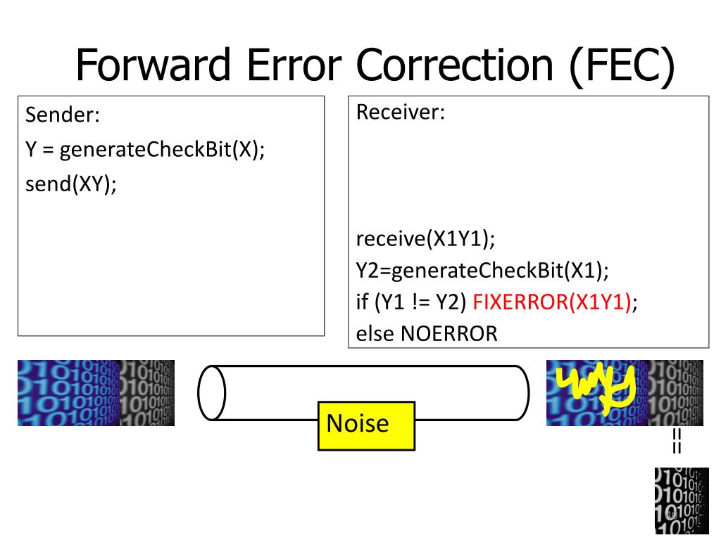 Forward Error Correction (FEC) Receiver: receive(X1Y1); Y2=generateCheckBit(X1); if (Y1 != Y2) FIXERROR(X1Y1); else NOERROR Sender: Y = generateCheckBit(X); send(XY); Noise !=