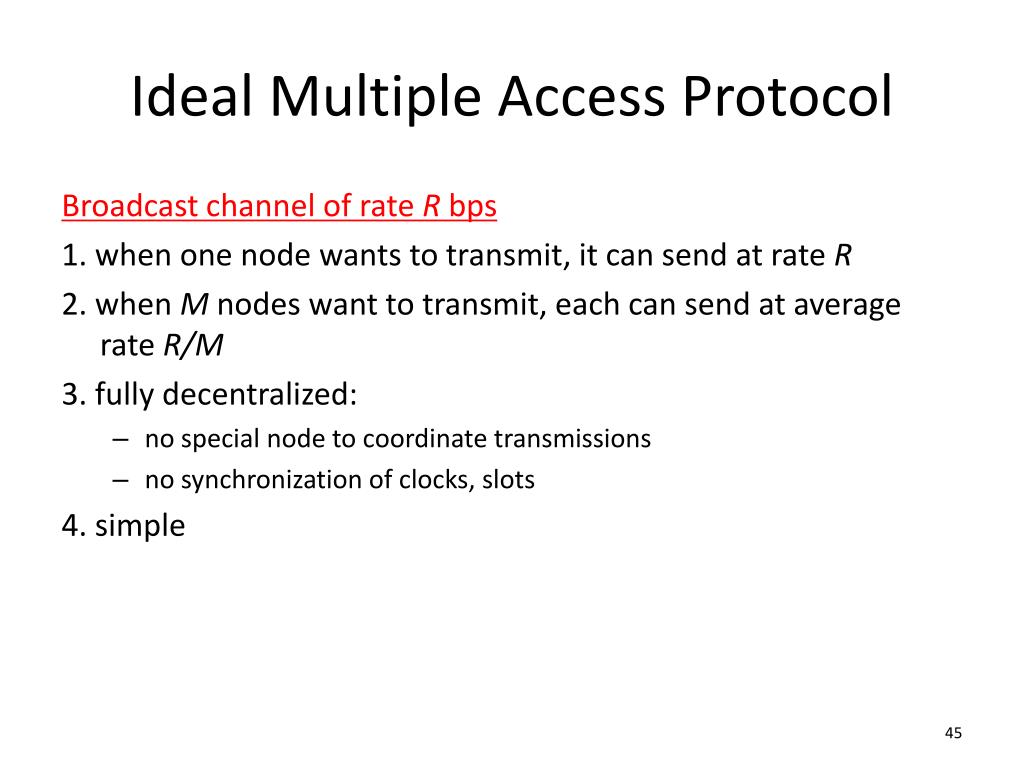 Ideal Multiple Access Protocol Broadcast channel of rate R bps 1. when one node wants to transmit, it can send at rate R 2. when M nodes want to transmit, each can send at average rate R/M 3. fully decentralized: • no special node to coordinate transmissions • no synchronization of clocks, slots 4. simple