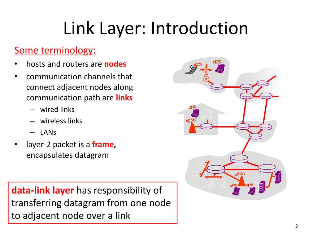 Some terminology: hosts and routers are nodes communication channels that connect adjacent nodes along communication path are links wired links wireless links LANs layer-2 packet is a frame,encapsulates datagram Link Layer: Introduction data-link layer has responsibility of transferring datagram from one node to adjacent node over a link