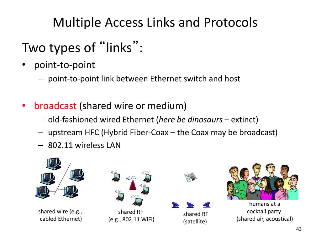 Multiple Access Links and Protocols Two types of “links”: • point-to-point • point-to-point link between Ethernet switch and host • broadcast (shared wire or medium) • old-fashioned wired Ethernet (here be dinosaurs – extinct) • upstream HFC (Hybrid Fiber-Coax – the Coax may be broadcast) • 802.11 wireless LAN humans at a cocktail party (shared air, acoustical) shared wire (e.g., cabled Ethernet) shared RF (e.g., 802.11 WiFi) shared RF (satellite)