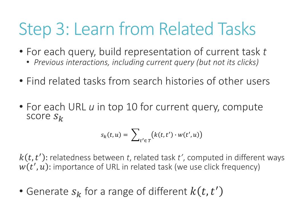 Step 3: Learn from Related Tasks • For each query, build representation of current task t • Previous interactions, including current query (but not its clicks) • Find related tasks from search histories of other users • For each URL u in top 10 for current query, compute score • relatedness between t, related task t’, computed in different ways • importance of URL in related task (we use click frequency) • Generate for a range of different