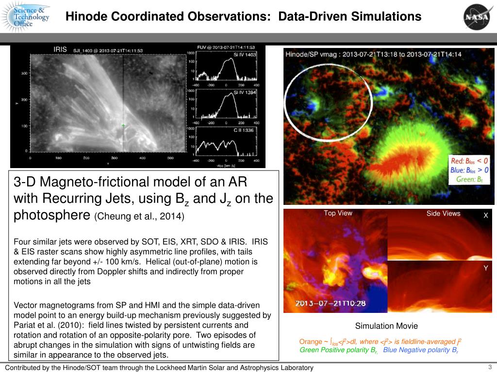 Hinode Coordinated Observations: Data-Driven Simulations IRIS 3-D Magneto-frictional model of an AR with Recurring Jets, using Bz and Jzon the photosphere (Cheung et al., 2014) Four similar jets were observed by SOT, EIS, XRT, SDO & IRIS. IRIS & EIS raster scans show highly asymmetric line profiles, with tails extending far beyond +/- 100 km/s. Helical (out-of-plane) motion is observed directly from Doppler shifts and indirectly from proper motions in all the jets Vector magnetograms from SP and HMI and the simple data-driven model point to an energy build-up mechanism previously suggested by Pariat et al. (2010): field lines twisted by persistent currents and rotation and rotation of an opposite-polarity pore. Two episodes of abrupt changes in the simulation with signs of untwisting fields are similar in appearance to the observed jets. Top View Side Views X Y Simulation Movie Orange ~ ∫los<j2>dl, where <j2> is fieldline-averaged j2 Green Positive polarity Br, Blue Negative polarity Br Contributed by the Hinode/SOT team through the Lockheed Martin Solar and Astrophysics Laboratory