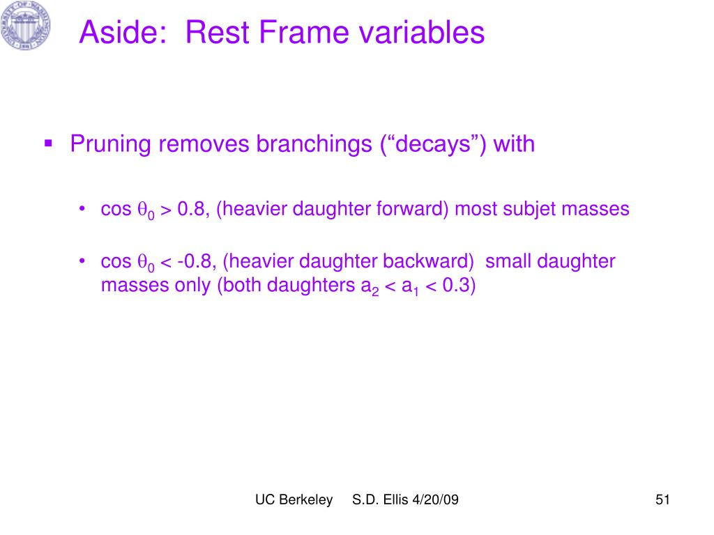 Aside: Rest Frame variables • Pruning removes branchings (“decays”) with • cos0 > 0.8, (heavier daughter forward) most subjet masses • cos0 < -0.8, (heavier daughter backward) small daughter masses only (both daughters a2 < a1< 0.3) UC Berkeley S.D. Ellis 4/20/09