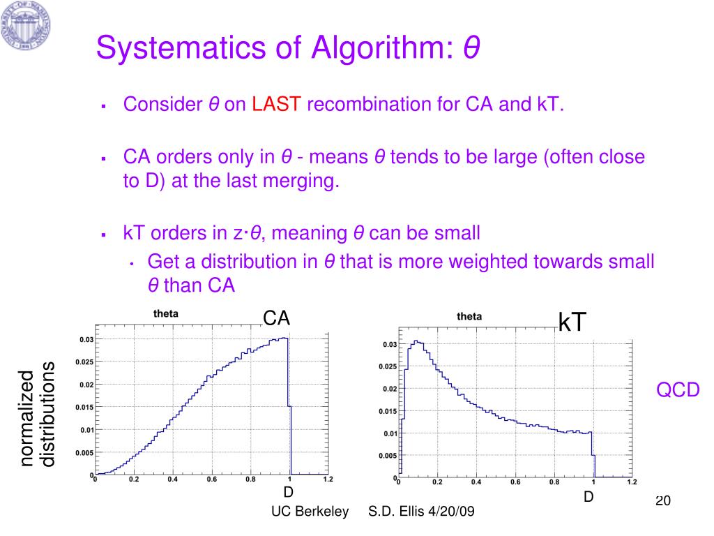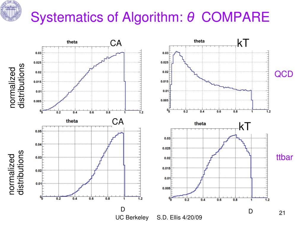 Systematics of Algorithm: θ COMPARE kT CA QCD normalized distributions CA kT ttbar normalized distributions D D UC Berkeley S.D. Ellis 4/20/09