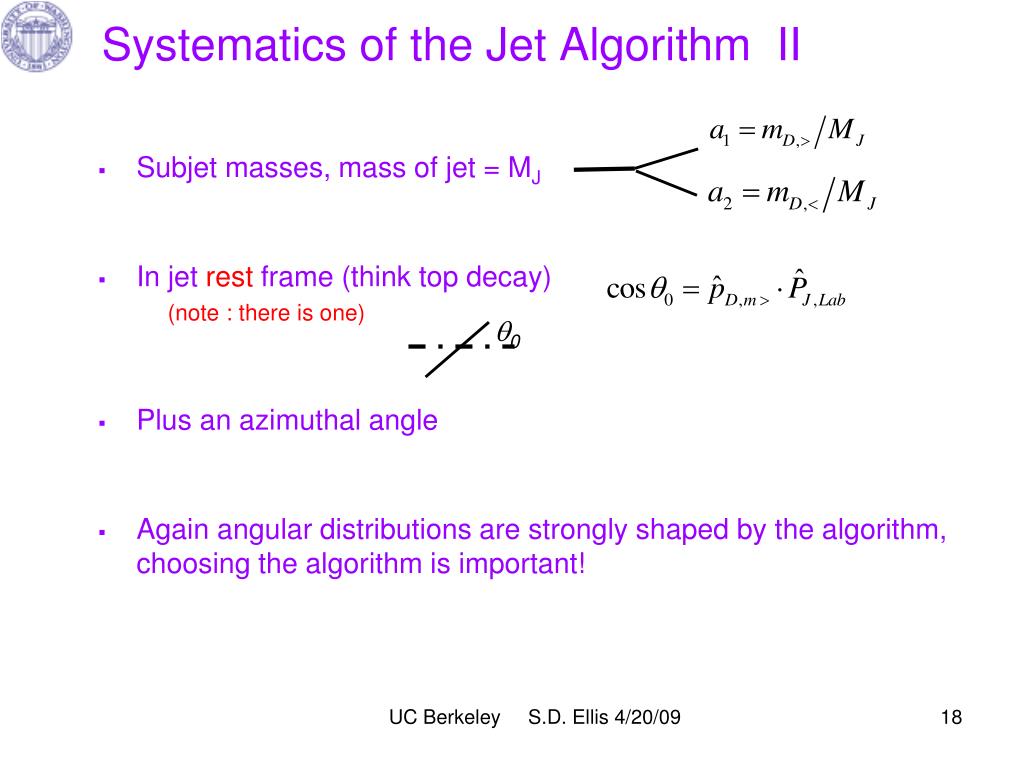 Systematics of the Jet Algorithm II • Subjet masses, mass of jet = MJ • In jet rest frame (think top decay) (note : there is one) • Plus an azimuthal angle • Again angular distributions are strongly shaped by the algorithm, choosing the algorithm is important! 0 UC Berkeley S.D. Ellis 4/20/09