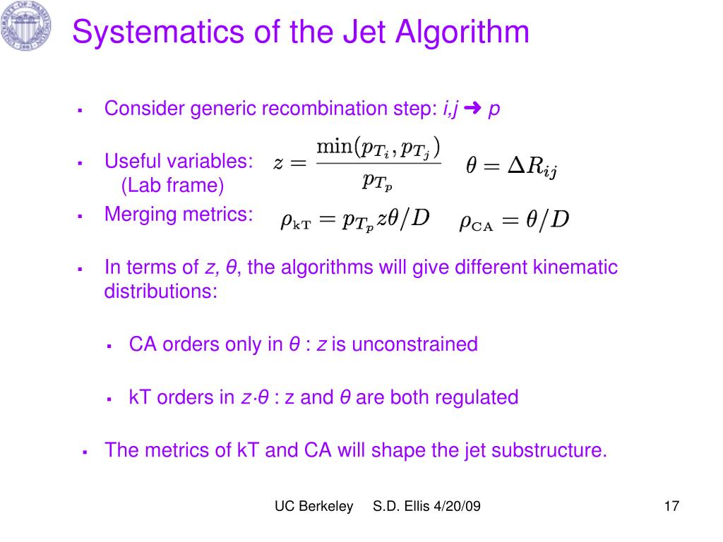 Systematics of the Jet Algorithm • Consider generic recombination step: i,j➜p • Useful variables: (Lab frame) • Merging metrics: • In terms of z, θ, the algorithms will give different kinematic distributions: • CA orders only in θ: z is unconstrained • kTorders in z·θ: z and θ are both regulated • The metrics of kT and CA will shape the jet substructure. UC Berkeley S.D. Ellis 4/20/09
