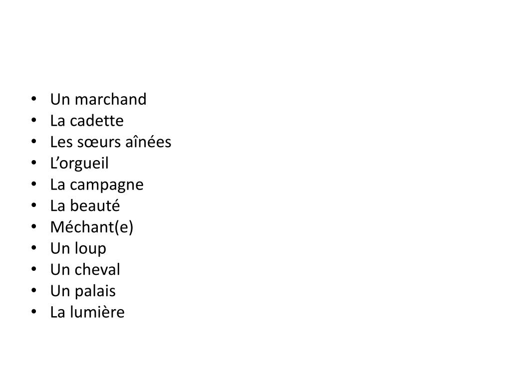 Un marchand • La cadette • Les sœursaînées • L’orgueil • La campagne • La beauté • Méchant(e) • Un loup • Un cheval • Un palais • La lumière