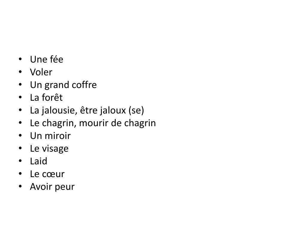 Unefée • Voler • Un grand coffre • La forêt • La jalousie, êtrejaloux (se) • Le chagrin, mourir de chagrin • Un miroir • Le visage • Laid • Le cœur • Avoirpeur