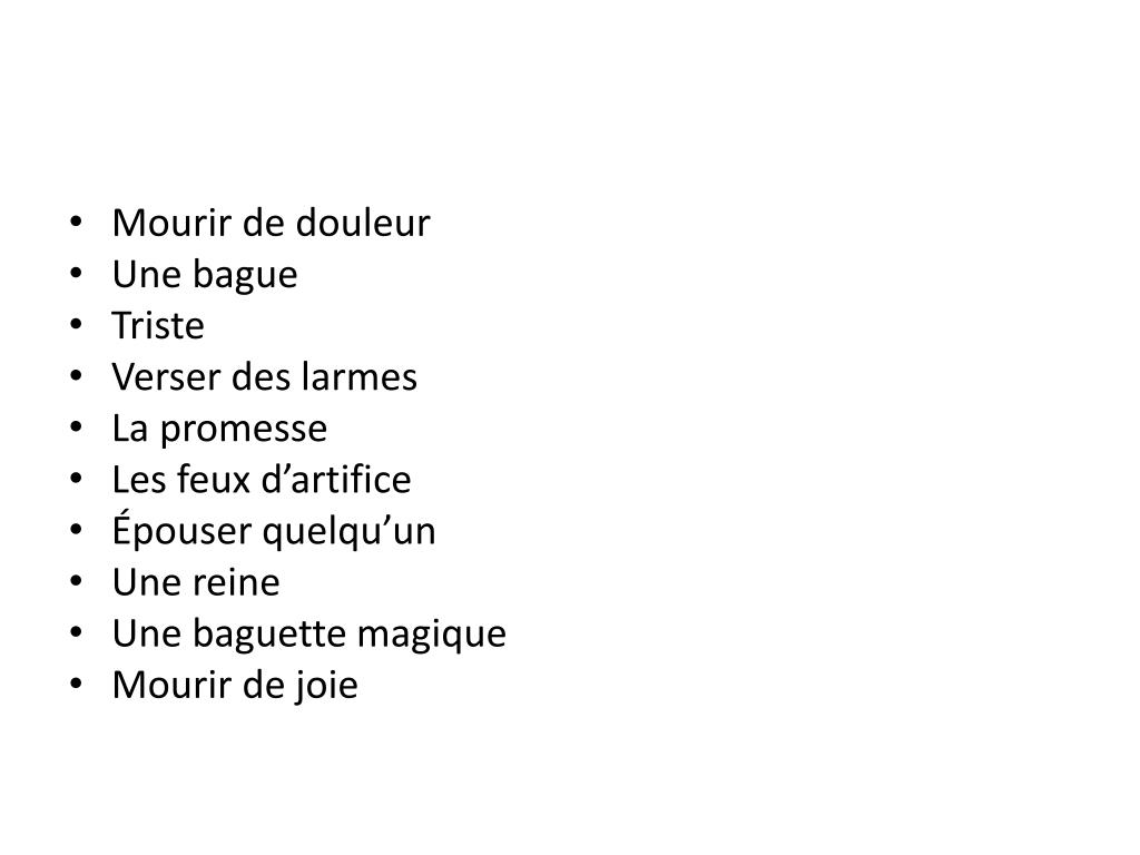 Mourir de douleur • Unebague • Triste • Verser des larmes • La promesse • Les feuxd’artifice • Épouserquelqu’un • Unereine • Une baguette magique • Mourir de joie