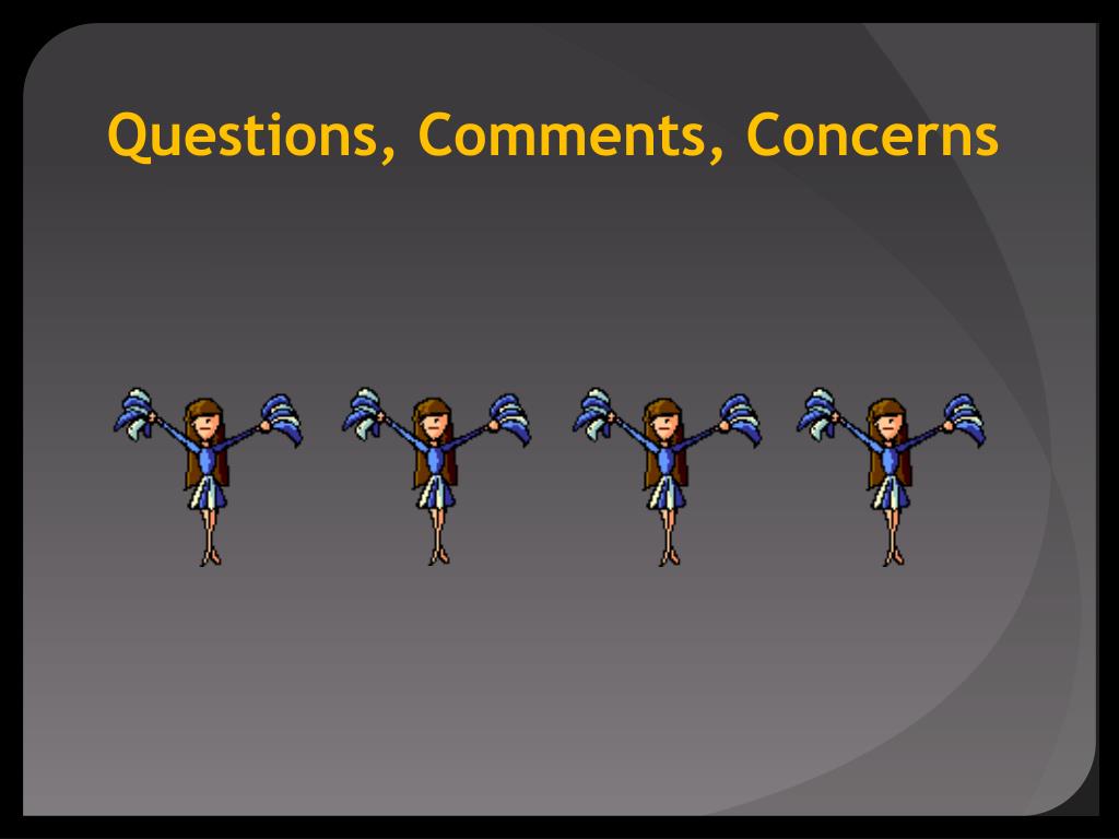 Communication Expectations • Self-advocacy is taught at the high school level • If a cheerleader has a concern, she needs to bring it to her coach first, either on her own or with a friend. • At home, ask your daughter if she has spoken with her coach before before bringing us concerns. • If there is still unrest about how the coach has handled a concern with your daughter, talk to us! Do not go first to the board or a principal with a concern they are unfamiliar with- talk to your coach!