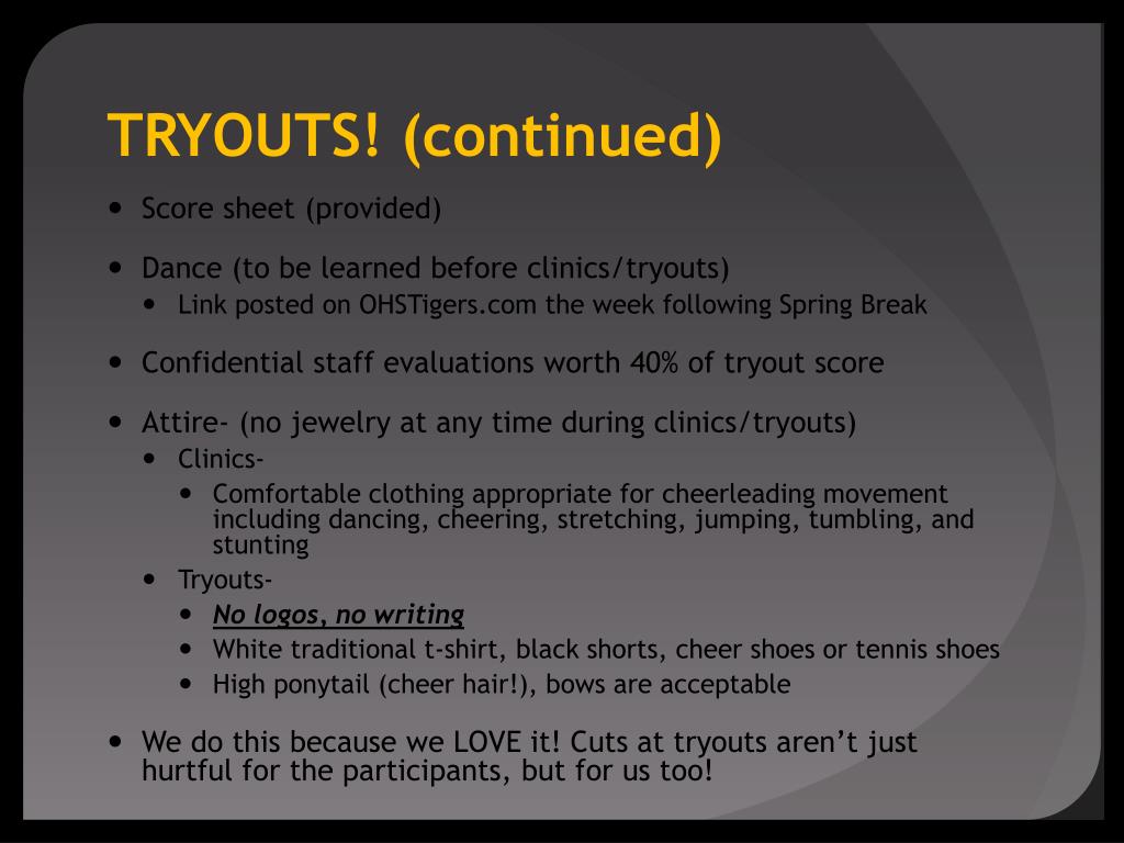 TRYOUTS! (continued) • Score sheet (provided) • Dance (to be learned before clinics/tryouts) • Link posted on OHSTigers.com the week following Spring Break • Confidential staff evaluations worth 40% of tryout score • Attire- (no jewelry at any time during clinics/tryouts) • Clinics- • Comfortable clothing appropriate for cheerleading movement including dancing, cheering, stretching, jumping, tumbling, and stunting • Tryouts- • No logos, no writing • White traditional t-shirt, black shorts, cheer shoes or tennis shoes • High ponytail (cheer hair!), bows are acceptable • We do this because we LOVE it! Cuts at tryouts aren’t just hurtful for the participants, but for us too!