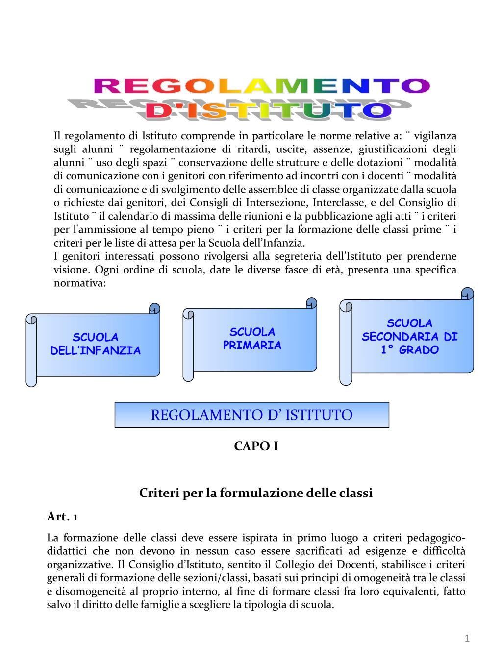 REGOLAMENTO D'ISTITUTO Il regolamento di Istituto comprende in particolare le norme relative a: ¨ vigilanza sugli alunni ¨ regolamentazione di ritardi, uscite, assenze, giustificazioni degli alunni ¨ uso degli spazi ¨ conservazione delle strutture e delle dotazioni ¨ modalità di comunicazione con i genitori con riferimento ad incontri con i docenti ¨ modalità di comunicazione e di svolgimento delle assemblee di classe organizzate dalla scuola o richieste dai genitori, dei Consigli di Intersezione, Interclasse, e del Consiglio di Istituto ¨ il calendario di massima delle riunioni e la pubblicazione agli atti ¨ i criteri per l'ammissione al tempo pieno ¨ i criteri per la formazione delle classi prime ¨ i criteri per le liste di attesa per la Scuola dell’Infanzia. I genitori interessati possono rivolgersi alla segreteria dell'Istituto per prenderne visione. Ogni ordine di scuola, date le diverse fasce di età, presenta una specifica normativa: SCUOLA SECONDARIA DI 1° GRADO SCUOLA PRIMARIA SCUOLA DELL’INFANZIA REGOLAMENTO D’ ISTITUTO CAPO I Criteri per la formulazione delle classi Art. 1 La formazione delle classi deve essere ispirata in primo luogo a criteri pedagogico-didattici che non devono in nessun caso essere sacrificati ad esigenze e difficoltà organizzative. Il Consiglio d’Istituto, sentito il Collegio dei Docenti, stabilisce i criteri generali di formazione delle sezioni/classi, basati sui principi di omogeneità tra le classi e disomogeneità al proprio interno, al fine di formare classi fra loro equivalenti, fatto salvo il diritto delle famiglie a scegliere la tipologia di scuola.