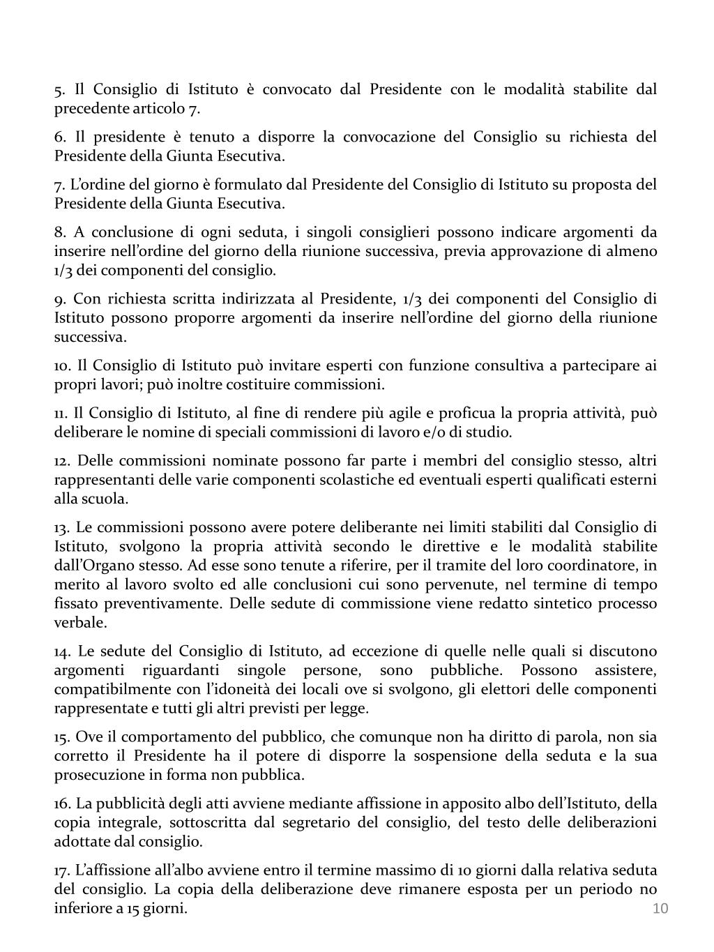 . Il Consiglio di Istituto è convocato dal Presidente con le modalità stabilite dal precedente articolo 7. • . Il presidente è tenuto a disporre la convocazione del Consiglio su richiesta del Presidente della Giunta Esecutiva. • . L’ordine del giorno è formulato dal Presidente del Consiglio di Istituto su proposta del Presidente della Giunta Esecutiva. • . A conclusione di ogni seduta, i singoli consiglieri possono indicare argomenti da inserire nell’ordine del giorno della riunione successiva, previa approvazione di almeno 1/3 dei componenti del consiglio. • . Con richiesta scritta indirizzata al Presidente, 1/3 dei componenti del Consiglio di Istituto possono proporre argomenti da inserire nell’ordine del giorno della riunione successiva. • . Il Consiglio di Istituto può invitare esperti con funzione consultiva a partecipare ai propri lavori; può inoltre costituire commissioni. • . Il Consiglio di Istituto, al fine di rendere più agile e proficua la propria attività, può deliberare le nomine di speciali commissioni di lavoro e/o di studio. • . Delle commissioni nominate possono far parte i membri del consiglio stesso, altri rappresentanti delle varie componenti scolastiche ed eventuali esperti qualificati esterni alla scuola. • . Le commissioni possono avere potere deliberante nei limiti stabiliti dal Consiglio di Istituto, svolgono la propria attività secondo le direttive e le modalità stabilite dall’Organo stesso. Ad esse sono tenute a riferire, per il tramite del loro coordinatore, in merito al lavoro svolto ed alle conclusioni cui sono pervenute, nel termine di tempo fissato preventivamente. Delle sedute di commissione viene redatto sintetico processo verbale. • . Le sedute del Consiglio di Istituto, ad eccezione di quelle nelle quali si discutono argomenti riguardanti singole persone, sono pubbliche. Possono assistere, compatibilmente con l’idoneità dei locali ove si svolgono, gli elettori delle componenti rappresentate e tutti gli altri previsti per legge. • . Ove il comportamento del pubblico, che comunque non ha diritto di parola, non sia corretto il Presidente ha il potere di disporre la sospensione della seduta e la sua prosecuzione in forma non pubblica. • . La pubblicità degli atti avviene mediante affissione in apposito albo dell’Istituto, della copia integrale, sottoscritta dal segretario del consiglio, del testo delle deliberazioni adottate dal consiglio. • . L’affissione all’albo avviene entro il termine massimo di 10 giorni dalla relativa seduta del consiglio. La copia della deliberazione deve rimanere esposta per un periodo no inferiore a 15 giorni.
