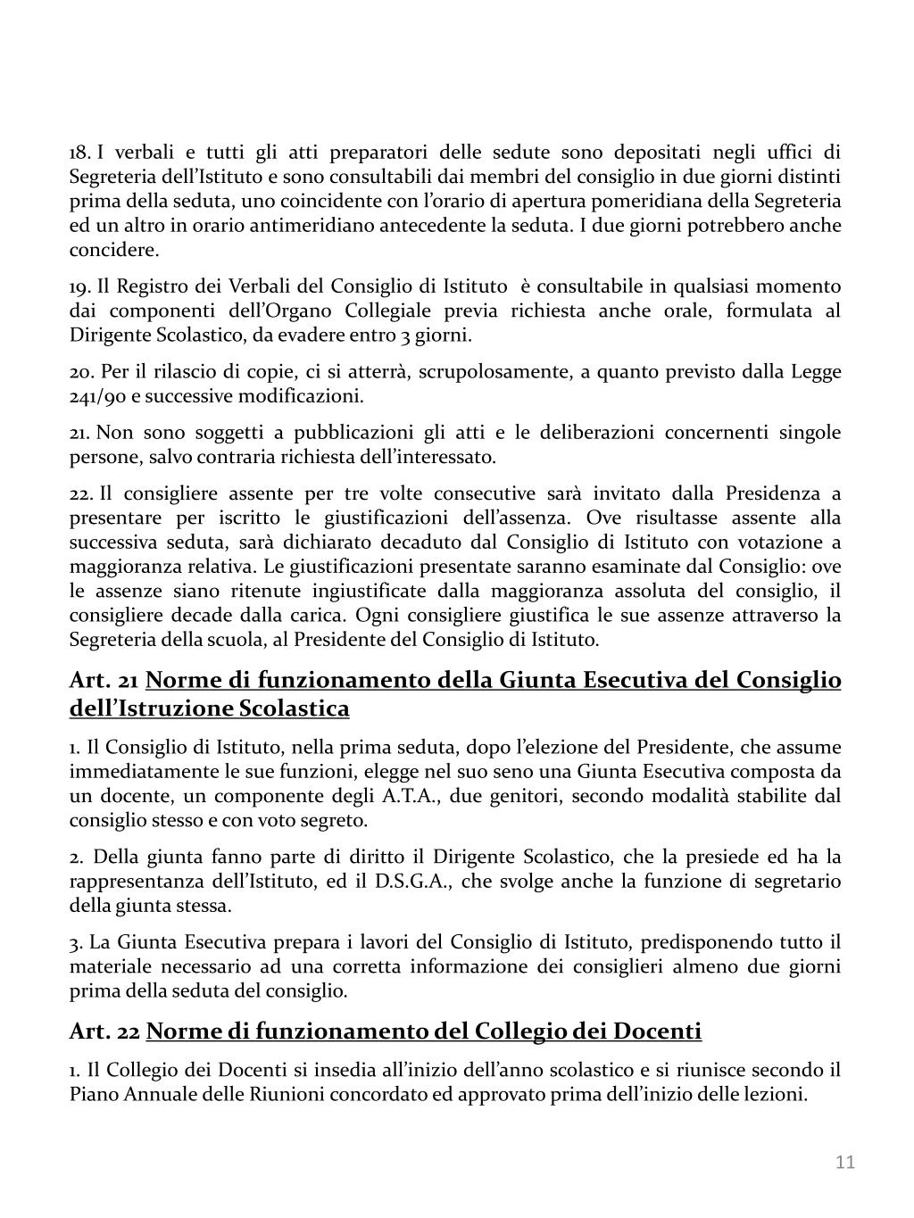 I verbali e tutti gli atti preparatori delle sedute sono depositati negli uffici di Segreteria dell’Istituto e sono consultabili dai membri del consiglio in due giorni distinti prima della seduta, uno coincidente con l’orario di apertura pomeridiana della Segreteria ed un altro in orario antimeridiano antecedente la seduta. I due giorni potrebbero anche concidere. • Il Registro dei Verbali del Consiglio di Istituto è consultabile in qualsiasi momento dai componenti dell’Organo Collegiale previa richiesta anche orale, formulata al Dirigente Scolastico, da evadere entro 3 giorni. • Per il rilascio di copie, ci si atterrà, scrupolosamente, a quanto previsto dalla Legge 241/90 e successive modificazioni. • Non sono soggetti a pubblicazioni gli atti e le deliberazioni concernenti singole persone, salvo contraria richiesta dell’interessato. • Il consigliere assente per tre volte consecutive sarà invitato dalla Presidenza a presentare per iscritto le giustificazioni dell’assenza. Ove risultasse assente alla successiva seduta, sarà dichiarato decaduto dal Consiglio di Istituto con votazione a maggioranza relativa. Le giustificazioni presentate saranno esaminate dal Consiglio: ove le assenze siano ritenute ingiustificate dalla maggioranza assoluta del consiglio, il consigliere decade dalla carica. Ogni consigliere giustifica le sue assenze attraverso la Segreteria della scuola, al Presidente del Consiglio di Istituto. • Art. 21 Norme di funzionamento della Giunta Esecutiva del Consiglio dell’Istruzione Scolastica • 1. Il Consiglio di Istituto, nella prima seduta, dopo l’elezione del Presidente, che assume immediatamente le sue funzioni, elegge nel suo seno una Giunta Esecutiva composta da un docente, un componente degli A.T.A., due genitori, secondo modalità stabilite dal consiglio stesso e con voto segreto. • 2. Della giunta fanno parte di diritto il Dirigente Scolastico, che la presiede ed ha la rappresentanza dell’Istituto, ed il D.S.G.A., che svolge anche la funzione di segretario della giunta stessa. • La Giunta Esecutiva prepara i lavori del Consiglio di Istituto, predisponendo tutto il materiale necessario ad una corretta informazione dei consiglieri almeno due giorni prima della seduta del consiglio. • Art. 22 Norme di funzionamento del Collegio dei Docenti • 1. Il Collegio dei Docenti si insedia all’inizio dell’anno scolastico e si riunisce secondo il Piano Annuale delle Riunioni concordato ed approvato prima dell’inizio delle lezioni.