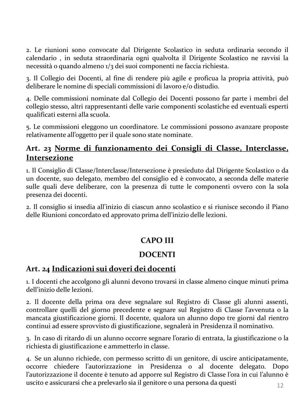 2. Le riunioni sono convocate dal Dirigente Scolastico in seduta ordinaria secondo il calendario , in seduta straordinaria ogni qualvolta il Dirigente Scolastico ne ravvisi la necessità o quando almeno 1/3 dei suoi componenti ne faccia richiesta. • 3. Il Collegio dei Docenti, al fine di rendere più agile e proficua la propria attività, può deliberare le nomine di speciali commissioni di lavoro e/o distudio. • 4. Delle commissioni nominate dal Collegio dei Docenti possono far parte i membri del collegio stesso, altri rappresentanti delle varie componenti scolastiche ed eventuali esperti qualificati esterni alla scuola. • 5. Le commissioni eleggono un coordinatore. Le commissioni possono avanzare proposte relativamente all’oggetto per il quale sono state nominate. • Art. 23 Norme di funzionamento dei Consigli di Classe, Interclasse, Intersezione • 1. Il Consiglio di Classe/Interclasse/Intersezione è presieduto dal Dirigente Scolastico o da un docente, suo delegato, membro del consiglio ed è convocato, a seconda delle materie sulle quali deve deliberare, con la presenza di tutte le componenti ovvero con la sola presenza dei docenti. • 2. Il consiglio si insedia all’inizio di ciascun anno scolastico e si riunisce secondo il Piano delle Riunioni concordato ed approvato prima dell’inizio delle lezioni. • CAPO III • DOCENTI • Art. 24 Indicazioni sui doveri dei docenti • 1. I docenti che accolgono gli alunni devono trovarsi in classe almeno cinque minuti prima dell’inizio delle lezioni. • Il docente della prima ora deve segnalare sul Registro di Classe gli alunni assenti, controllare quelli del giorno precedente e segnare sul Registro di Classe l’avvenuta o la mancata giustificazione giorni. Il docente, qualora un alunno dopo tre giorni dal rientro continui ad essere sprovvisto di giustificazione, segnalerà in Presidenza il nominativo. • In caso di ritardo di un alunno occorre segnare l’orario di entrata, la giustificazione o la richiesta di giustificazione e ammetterlo in classe. • Se un alunno richiede, con permesso scritto di un genitore, di uscire anticipatamente, occorre chiedere l’autorizzazione in Presidenza o al docente delegato. Dopo l’autorizzazione il docente è tenuto ad apporre sul Registro di Classe l’ora in cui l’alunno è uscito e assicurarsi che a prelevarlo sia il genitore o una persona da questi