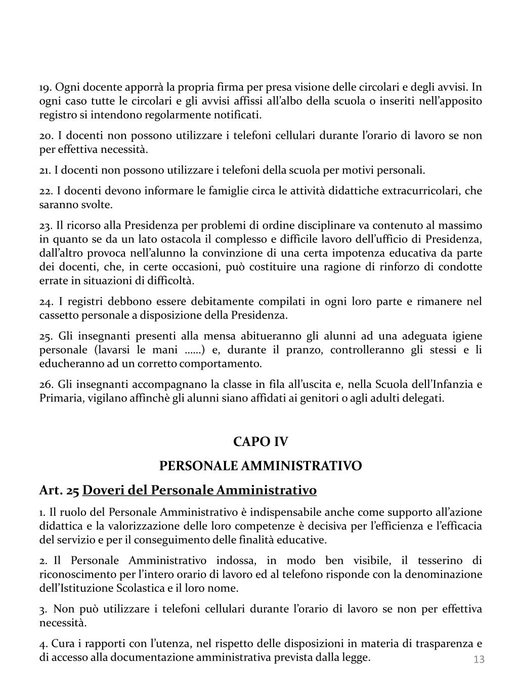 19. Ogni docente apporrà la propria firma per presa visione delle circolari e degli avvisi. In ogni caso tutte le circolari e gli avvisi affissi all’albo della scuola o inseriti nell’apposito registro si intendono regolarmente notificati. • 20. I docenti non possono utilizzare i telefoni cellulari durante l’orario di lavoro se non per effettiva necessità. • 21. I docenti non possono utilizzare i telefoni della scuola per motivi personali. • 22. I docenti devono informare le famiglie circa le attività didattiche extracurricolari, che saranno svolte. • 23. Il ricorso alla Presidenza per problemi di ordine disciplinare va contenuto al massimo in quanto se da un lato ostacola il complesso e difficile lavoro dell’ufficio di Presidenza, dall’altro provoca nell’alunno la convinzione di una certa impotenza educativa da parte dei docenti, che, in certe occasioni, può costituire una ragione di rinforzo di condotte errate in situazioni di difficoltà. • 24. I registri debbono essere debitamente compilati in ogni loro parte e rimanere nel cassetto personale a disposizione della Presidenza. • 25. Gli insegnanti presenti alla mensa abitueranno gli alunni ad una adeguata igiene personale (lavarsi le mani ……) e, durante il pranzo, controlleranno gli stessi e li educheranno ad un corretto comportamento. • 26. Gli insegnanti accompagnano la classe in fila all’uscita e, nella Scuola dell’Infanzia e Primaria, vigilano affinchè gli alunni siano affidati ai genitori o agli adulti delegati. • CAPO IV • PERSONALE AMMINISTRATIVO • Art. 25 Doveri del Personale Amministrativo • 1. Il ruolo del Personale Amministrativo è indispensabile anche come supporto all’azione didattica e la valorizzazione delle loro competenze è decisiva per l’efficienza e l’efficacia del servizio e per il conseguimento delle finalità educative. • Il Personale Amministrativo indossa, in modo ben visibile, il tesserino di riconoscimento per l’intero orario di lavoro ed al telefono risponde con la denominazione dell’Istituzione Scolastica e il loro nome. • Non può utilizzare i telefoni cellulari durante l’orario di lavoro se non per effettiva necessità. • Cura i rapporti con l’utenza, nel rispetto delle disposizioni in materia di trasparenza e di accesso alla documentazione amministrativa prevista dalla legge.