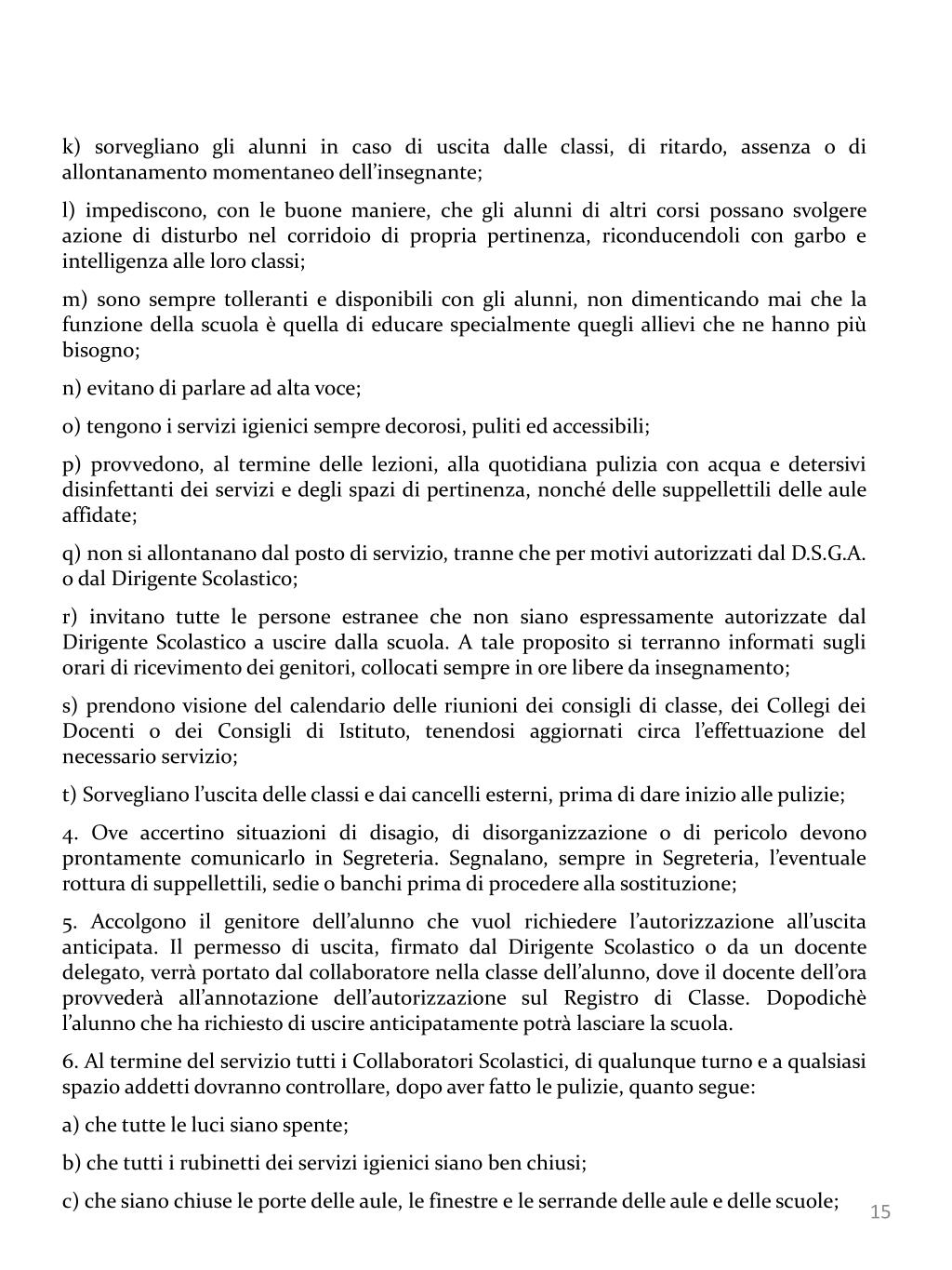 k) sorvegliano gli alunni in caso di uscita dalle classi, di ritardo, assenza o di allontanamento momentaneo dell’insegnante; l) impediscono, con le buone maniere, che gli alunni di altri corsi possano svolgere azione di disturbo nel corridoio di propria pertinenza, riconducendoli con garbo e intelligenza alle loro classi; m) sono sempre tolleranti e disponibili con gli alunni, non dimenticando mai che la funzione della scuola è quella di educare specialmente quegli allievi che ne hanno più bisogno; n) evitano di parlare ad alta voce; o) tengono i servizi igienici sempre decorosi, puliti ed accessibili; p) provvedono, al termine delle lezioni, alla quotidiana pulizia con acqua e detersivi disinfettanti dei servizi e degli spazi di pertinenza, nonché delle suppellettili delle aule affidate; q) non si allontanano dal posto di servizio, tranne che per motivi autorizzati dal D.S.G.A. o dal Dirigente Scolastico; r) invitano tutte le persone estranee che non siano espressamente autorizzate dal Dirigente Scolastico a uscire dalla scuola. A tale proposito si terranno informati sugli orari di ricevimento dei genitori, collocati sempre in ore libere da insegnamento; s) prendono visione del calendario delle riunioni dei consigli di classe, dei Collegi dei Docenti o dei Consigli di Istituto, tenendosi aggiornati circa l’effettuazione del necessario servizio; t) Sorvegliano l’uscita delle classi e dai cancelli esterni, prima di dare inizio alle pulizie; 4. Ove accertino situazioni di disagio, di disorganizzazione o di pericolo devono prontamente comunicarlo in Segreteria. Segnalano, sempre in Segreteria, l’eventuale rottura di suppellettili, sedie o banchi prima di procedere alla sostituzione; 5. Accolgono il genitore dell’alunno che vuol richiedere l’autorizzazione all’uscita anticipata. Il permesso di uscita, firmato dal Dirigente Scolastico o da un docente delegato, verrà portato dal collaboratore nella classe dell’alunno, dove il docente dell’ora provvederà all’annotazione dell’autorizzazione sul Registro di Classe. Dopodichè l’alunno che ha richiesto di uscire anticipatamente potrà lasciare la scuola. 6. Al termine del servizio tutti i Collaboratori Scolastici, di qualunque turno e a qualsiasi spazio addetti dovranno controllare, dopo aver fatto le pulizie, quanto segue: a) che tutte le luci siano spente; b) che tutti i rubinetti dei servizi igienici siano ben chiusi; c) che siano chiuse le porte delle aule, le finestre e le serrande delle aule e delle scuole;