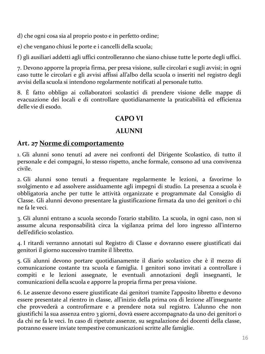 d) che ogni cosa sia al proprio posto e in perfetto ordine; • e) che vengano chiusi le porte e i cancelli della scuola; • f) gli ausiliari addetti agli uffici controlleranno che siano chiuse tutte le porte degli uffici. • 7. Devono apporre la propria firma, per presa visione, sulle circolari e sugli avvisi; in ogni caso tutte le circolari e gli avvisi affissi all’albo della scuola o inseriti nel registro degli avvisi della scuola si intendono regolarmente notificati al personale tutto. • 8. È fatto obbligo ai collaboratori scolastici di prendere visione delle mappe di evacuazione dei locali e di controllare quotidianamente la praticabilità ed efficienza delle vie di esodo. • CAPO VI • ALUNNI • Art. 27 Norme di comportamento • Gli alunni sono tenuti ad avere nei confronti del Dirigente Scolastico, di tutto il personale e dei compagni, lo stesso rispetto, anche formale, consono ad una convivenza civile. • Gli alunni sono tenuti a frequentare regolarmente le lezioni, a favorirne lo svolgimento e ad assolvere assiduamente agli impegni di studio. La presenza a scuola è obbligatoria anche per tutte le attività organizzate e programmate dal Consiglio di Classe. Gli alunni devono presentare la giustificazione firmata da uno dei genitori o chi ne fa le veci. • Gli alunni entrano a scuola secondo l’orario stabilito. La scuola, in ogni caso, non si assume alcuna responsabilità circa la vigilanza prima del loro ingresso all’interno dell’edificio scolastico. • I ritardi verranno annotati sul Registro di Classe e dovranno essere giustificati dai genitori il giorno successivo tramite il libretto. • Gli alunni devono portare quotidianamente il diario scolastico che è il mezzo di comunicazione costante tra scuola e famiglia. I genitori sono invitati a controllare i compiti e le lezioni assegnate, le eventuali annotazioni degli insegnanti, le comunicazioni della scuola e apporre la propria firma per presa visione. • Le assenze devono essere giustificate dai genitori tramite l’apposito libretto e devono essere presentate al rientro in classe, all’inizio della prima ora di lezione all’insegnante che provvederà a controfirmare e a prendere nota sul registro. L’alunno che non giustifichi la sua assenza entro 3 giorni, dovrà essere accompagnato da uno dei genitori o da chi ne fa le veci. In caso di ripetute assenze, su segnalazione dei docenti della classe, potranno essere inviate tempestive comunicazioni scritte alle famiglie.