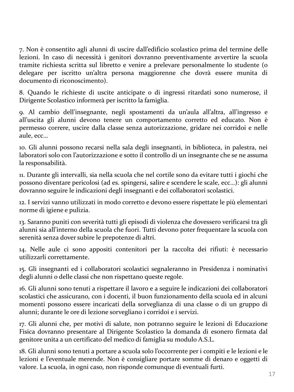 7. Non è consentito agli alunni di uscire dall’edificio scolastico prima del termine delle lezioni. In caso di necessità i genitori dovranno preventivamente avvertire la scuola tramite richiesta scritta sul libretto e venire a prelevare personalmente lo studente (o delegare per iscritto un’altra persona maggiorenne che dovrà essere munita di documento di riconoscimento). 8. Quando le richieste di uscite anticipate o di ingressi ritardati sono numerose, il Dirigente Scolastico informerà per iscritto la famiglia. 9. Al cambio dell’insegnante, negli spostamenti da un’aula all’altra, all’ingresso e all’uscita gli alunni devono tenere un comportamento corretto ed educato. Non è permesso correre, uscire dalla classe senza autorizzazione, gridare nei corridoi e nelle aule, ecc… 10. Gli alunni possono recarsi nella sala degli insegnanti, in biblioteca, in palestra, nei laboratori solo con l’autorizzazione e sotto il controllo di un insegnante che se ne assuma la responsabilità. 11. Durante gli intervalli, sia nella scuola che nel cortile sono da evitare tutti i giochi che possono diventare pericolosi (ad es. spingersi, salire e scendere le scale, ecc…): gli alunni dovranno seguire le indicazioni degli insegnanti e dei collaboratori scolastici. 12. I servizi vanno utilizzati in modo corretto e devono essere rispettate le più elementari norme di igiene e pulizia. 13. Saranno puniti con severità tutti gli episodi di violenza che dovessero verificarsi tra gli alunni sia all’interno della scuola che fuori. Tutti devono poter frequentare la scuola con serenità senza dover subire le prepotenze di altri. 14. Nelle aule ci sono appositi contenitori per la raccolta dei rifiuti: è necessario utilizzarli correttamente. 15. Gli insegnanti ed i collaboratori scolastici segnaleranno in Presidenza i nominativi degli alunni o delle classi che non rispettano queste regole. 16. Gli alunni sono tenuti a rispettare il lavoro e a seguire le indicazioni dei collaboratori scolastici che assicurano, con i docenti, il buon funzionamento della scuola ed in alcuni momenti possono essere incaricati della sorveglianza di una classe o di un gruppo di alunni; durante le ore di lezione sorvegliano i corridoi e i servizi. 17. Gli alunni che, per motivi di salute, non potranno seguire le lezioni di Educazione Fisica dovranno presentare al Dirigente Scolastico la domanda di esonero firmata dal genitore unita a un certificato del medico di famiglia su modulo A.S.L. 18. Gli alunni sono tenuti a portare a scuola solo l’occorrente per i compiti e le lezioni e le lezioni e l’eventuale merende. Non è consigliare portare somme di denaro e oggetti di valore. La scuola, in ogni caso, non risponde comunque di eventuali furti.