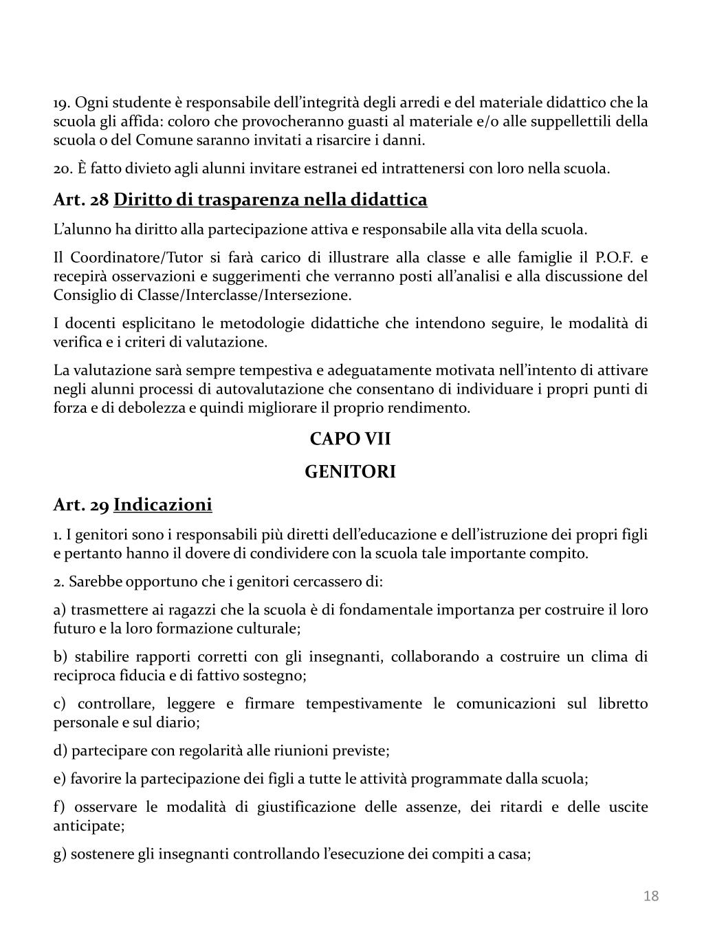 19. Ogni studente è responsabile dell’integrità degli arredi e del materiale didattico che la scuola gli affida: coloro che provocheranno guasti al materiale e/o alle suppellettili della scuola o del Comune saranno invitati a risarcire i danni. • 20. È fatto divieto agli alunni invitare estranei ed intrattenersi con loro nella scuola. • Art. 28 Diritto di trasparenza nella didattica • L’alunno ha diritto alla partecipazione attiva e responsabile alla vita della scuola. • Il Coordinatore/Tutor si farà carico di illustrare alla classe e alle famiglie il P.O.F. e recepirà osservazioni e suggerimenti che verranno posti all’analisi e alla discussione del Consiglio di Classe/Interclasse/Intersezione. • I docenti esplicitano le metodologie didattiche che intendono seguire, le modalità di verifica e i criteri di valutazione. • La valutazione sarà sempre tempestiva e adeguatamente motivata nell’intento di attivare negli alunni processi di autovalutazione che consentano di individuare i propri punti di forza e di debolezza e quindi migliorare il proprio rendimento. • CAPO VII • GENITORI • Art. 29 Indicazioni • I genitori sono i responsabili più diretti dell’educazione e dell’istruzione dei propri figli e pertanto hanno il dovere di condividere con la scuola tale importante compito. • 2. Sarebbe opportuno che i genitori cercassero di: • a) trasmettere ai ragazzi che la scuola è di fondamentale importanza per costruire il loro futuro e la loro formazione culturale; • b) stabilire rapporti corretti con gli insegnanti, collaborando a costruire un clima di reciproca fiducia e di fattivo sostegno; • c) controllare, leggere e firmare tempestivamente le comunicazioni sul libretto personale e sul diario; • d) partecipare con regolarità alle riunioni previste; • e) favorire la partecipazione dei figli a tutte le attività programmate dalla scuola; • f) osservare le modalità di giustificazione delle assenze, dei ritardi e delle uscite anticipate; • g) sostenere gli insegnanti controllando l’esecuzione dei compiti a casa;
