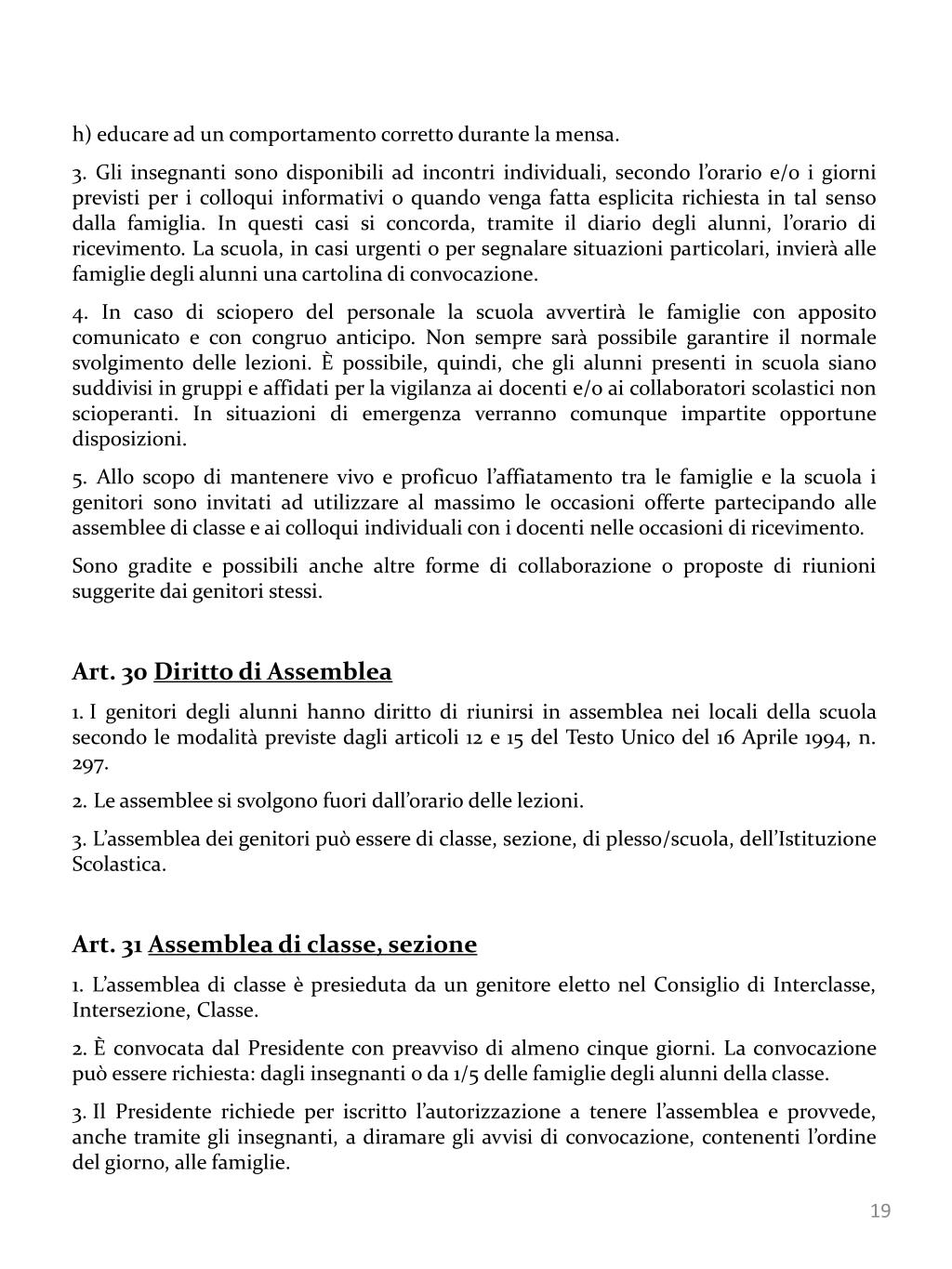 h) educare ad un comportamento corretto durante la mensa. • 3. Gli insegnanti sono disponibili ad incontri individuali, secondo l’orario e/o i giorni previsti per i colloqui informativi o quando venga fatta esplicita richiesta in tal senso dalla famiglia. In questi casi si concorda, tramite il diario degli alunni, l’orario di ricevimento. La scuola, in casi urgenti o per segnalare situazioni particolari, invierà alle famiglie degli alunni una cartolina di convocazione. • 4. In caso di sciopero del personale la scuola avvertirà le famiglie con apposito comunicato e con congruo anticipo. Non sempre sarà possibile garantire il normale svolgimento delle lezioni. È possibile, quindi, che gli alunni presenti in scuola siano suddivisi in gruppi e affidati per la vigilanza ai docenti e/o ai collaboratori scolastici non scioperanti. In situazioni di emergenza verranno comunque impartite opportune disposizioni. • 5. Allo scopo di mantenere vivo e proficuo l’affiatamento tra le famiglie e la scuola i genitori sono invitati ad utilizzare al massimo le occasioni offerte partecipando alle assemblee di classe e ai colloqui individuali con i docenti nelle occasioni di ricevimento. • Sono gradite e possibili anche altre forme di collaborazione o proposte di riunioni suggerite dai genitori stessi. • Art. 30 Diritto di Assemblea • I genitori degli alunni hanno diritto di riunirsi in assemblea nei locali della scuola secondo le modalità previste dagli articoli 12 e 15 del Testo Unico del 16 Aprile 1994, n. 297. • Le assemblee si svolgono fuori dall’orario delle lezioni. • L’assemblea dei genitori può essere di classe, sezione, di plesso/scuola, dell’Istituzione Scolastica. • Art. 31 Assemblea di classe, sezione • 1. L’assemblea di classe è presieduta da un genitore eletto nel Consiglio di Interclasse, Intersezione, Classe. • È convocata dal Presidente con preavviso di almeno cinque giorni. La convocazione può essere richiesta: dagli insegnanti o da 1/5 delle famiglie degli alunni della classe. • Il Presidente richiede per iscritto l’autorizzazione a tenere l’assemblea e provvede, anche tramite gli insegnanti, a diramare gli avvisi di convocazione, contenenti l’ordine del giorno, alle famiglie.