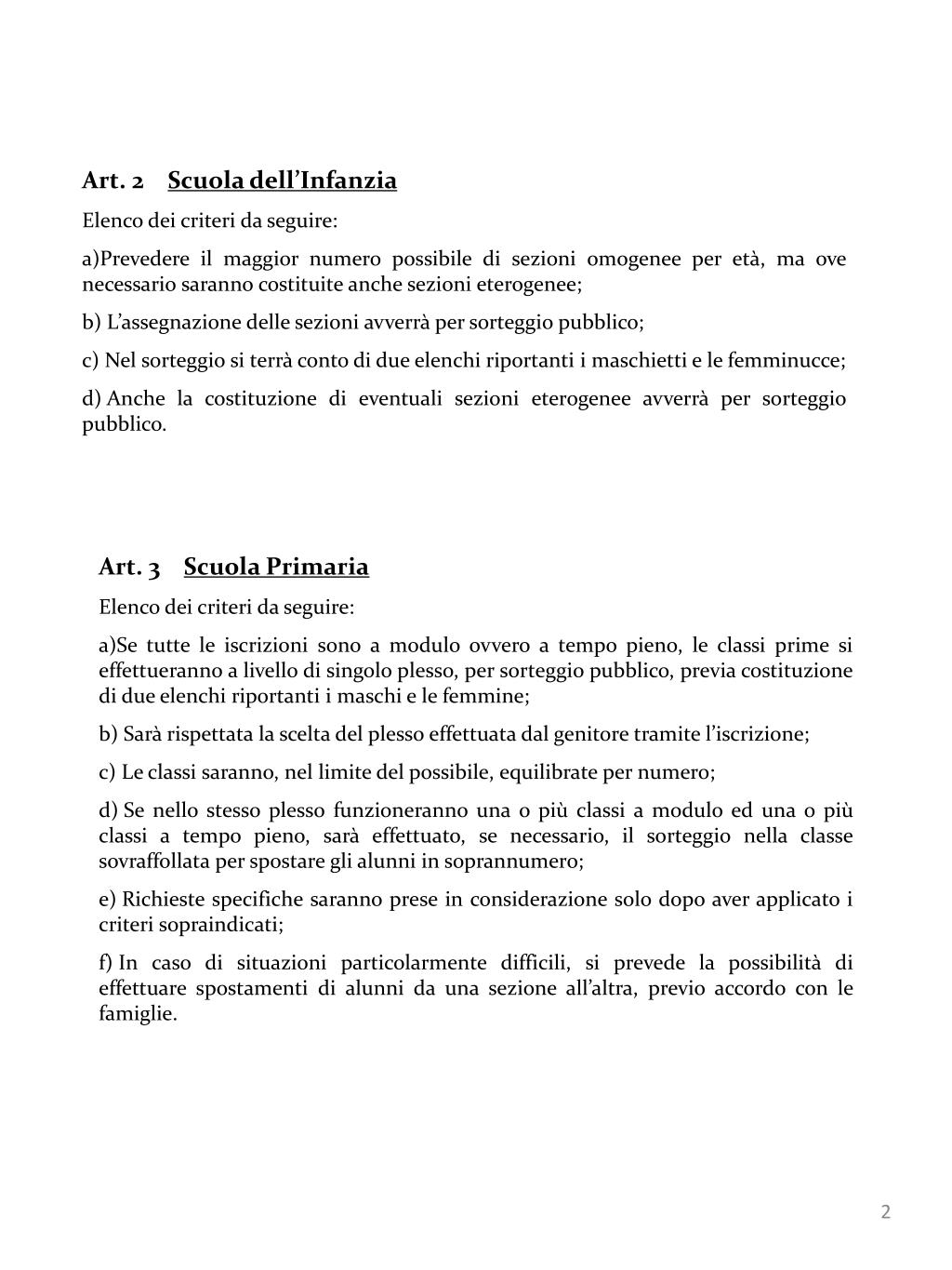 Art. 2 Scuola dell’Infanzia • Elenco dei criteri da seguire: • Prevedere il maggior numero possibile di sezioni omogenee per età, ma ove necessario saranno costituite anche sezioni eterogenee; • L’assegnazione delle sezioni avverrà per sorteggio pubblico; • Nel sorteggio si terrà conto di due elenchi riportanti i maschietti e le femminucce; • Anche la costituzione di eventuali sezioni eterogenee avverrà per sorteggio pubblico. • Art. 3 Scuola Primaria • Elenco dei criteri da seguire: • Se tutte le iscrizioni sono a modulo ovvero a tempo pieno, le classi prime si effettueranno a livello di singolo plesso, per sorteggio pubblico, previa costituzione di due elenchi riportanti i maschi e le femmine; • Sarà rispettata la scelta del plesso effettuata dal genitore tramite l’iscrizione; • Le classi saranno, nel limite del possibile, equilibrate per numero; • Se nello stesso plesso funzioneranno una o più classi a modulo ed una o più classi a tempo pieno, sarà effettuato, se necessario, il sorteggio nella classe sovraffollata per spostare gli alunni in soprannumero; • Richieste specifiche saranno prese in considerazione solo dopo aver applicato i criteri sopraindicati; • In caso di situazioni particolarmente difficili, si prevede la possibilità di effettuare spostamenti di alunni da una sezione all’altra, previo accordo con le famiglie.