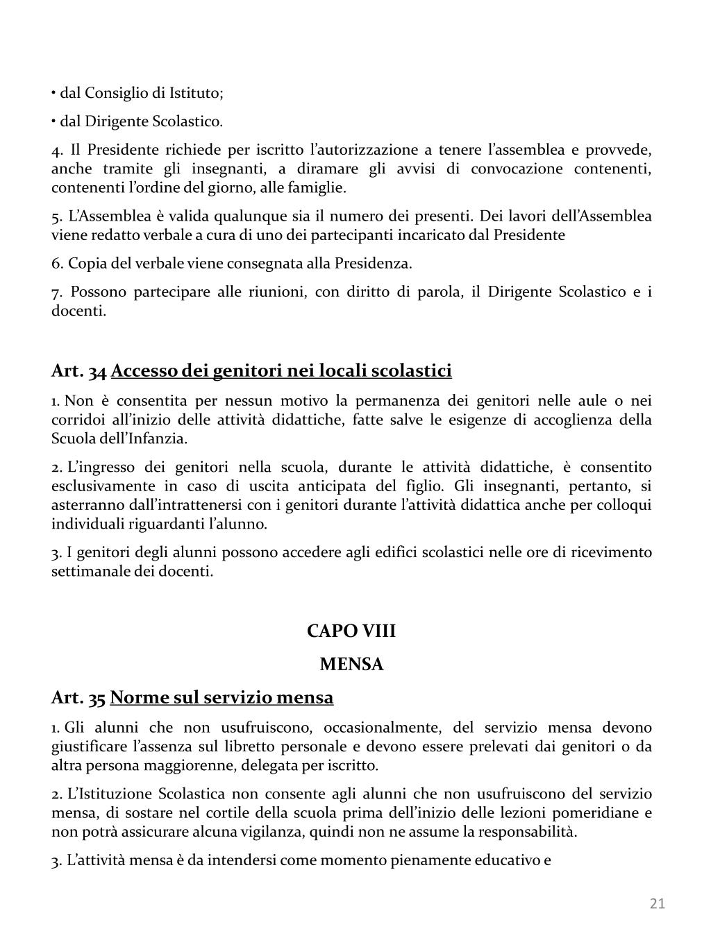 dal Consiglio di Istituto; • dal Dirigente Scolastico. • 4. Il Presidente richiede per iscritto l’autorizzazione a tenere l’assemblea e provvede, anche tramite gli insegnanti, a diramare gli avvisi di convocazione contenenti, contenenti l’ordine del giorno, alle famiglie. • 5. L’Assemblea è valida qualunque sia il numero dei presenti. Dei lavori dell’Assemblea viene redatto verbale a cura di uno dei partecipanti incaricato dal Presidente • 6. Copia del verbale viene consegnata alla Presidenza. • 7. Possono partecipare alle riunioni, con diritto di parola, il Dirigente Scolastico e i docenti. • Art. 34 Accesso dei genitori nei locali scolastici • Non è consentita per nessun motivo la permanenza dei genitori nelle aule o nei corridoi all’inizio delle attività didattiche, fatte salve le esigenze di accoglienza della Scuola dell’Infanzia. • L’ingresso dei genitori nella scuola, durante le attività didattiche, è consentito esclusivamente in caso di uscita anticipata del figlio. Gli insegnanti, pertanto, si asterranno dall’intrattenersi con i genitori durante l’attività didattica anche per colloqui individuali riguardanti l’alunno. • I genitori degli alunni possono accedere agli edifici scolastici nelle ore di ricevimento settimanale dei docenti. • CAPO VIII • MENSA • Art. 35 Norme sul servizio mensa • Gli alunni che non usufruiscono, occasionalmente, del servizio mensa devono giustificare l’assenza sul libretto personale e devono essere prelevati dai genitori o da altra persona maggiorenne, delegata per iscritto. • L’Istituzione Scolastica non consente agli alunni che non usufruiscono del servizio mensa, di sostare nel cortile della scuola prima dell’inizio delle lezioni pomeridiane e non potrà assicurare alcuna vigilanza, quindi non ne assume la responsabilità. • L’attività mensa è da intendersi come momento pienamente educativo e