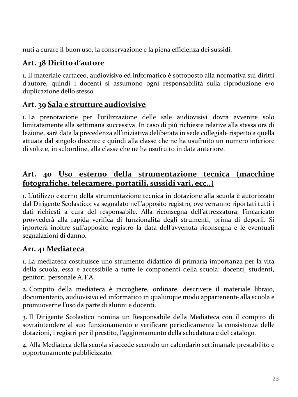 nuti a curare il buon uso, la conservazione e la piena efficienza dei sussidi. • Art. 38 Diritto d’autore • Il materiale cartaceo, audiovisivo ed informatico è sottoposto alla normativa sui diritti d’autore, quindi i docenti si assumono ogni responsabilità sulla riproduzione e/o duplicazione dello stesso. • Art. 39 Sala e strutture audiovisive • La prenotazione per l’utilizzazione delle sale audiovisivi dovrà avvenire solo limitatamente alla settimana successiva. In caso di più richieste relative alla stessa ora di lezione, sarà data la precedenza all’iniziativa deliberata in sede collegiale rispetto a quella attuata dal singolo docente e quindi alla classe che ne ha usufruito un numero inferiore di volte e, in subordine, alla classe che ne ha usufruito in data anteriore. • Art. 40 Uso esterno della strumentazione tecnica (macchine fotografiche, telecamere, portatili, sussidi vari, ecc..) • L’utilizzo esterno della strumentazione tecnica in dotazione alla scuola è autorizzato dal Dirigente Scolastico; va segnalato nell’apposito registro, ove verranno riportati tutti i dati richiesti a cura del responsabile. Alla riconsegna dell’attrezzatura, l’incaricato provvederà alla rapida verifica di funzionalità degli strumenti, prima di deporli. Si irporterà inoltre sull’apposito registro la data dell’avvenuta riconsegna e le eventuali segnalazioni di danno. • Arr. 41 Mediateca • La mediateca costituisce uno strumento didattico di primaria importanza per la vita della scuola, essa è accessibile a tutte le componenti della scuola: docenti, studenti, genitori, personale A.T.A. • Compito della mediateca è raccogliere, ordinare, descrivere il materiale libraio, documentario, audiovisivo ed informatico in qualunque modo appartenente alla scuola e promuoverne l’uso da parte di alunni e docenti. • Il Dirigente Scolastico nomina un Responsabile della Mediateca con il compito di sovraintendere al suo funzionamento e verificare periodicamente la consistenza delle dotazioni, i registri per il prestito, l’aggiornamento della schedatura e del catalogo. • Alla Mediateca della scuola si accede secondo un calendario settimanale prestabilito e opportunamente pubblicizzato.