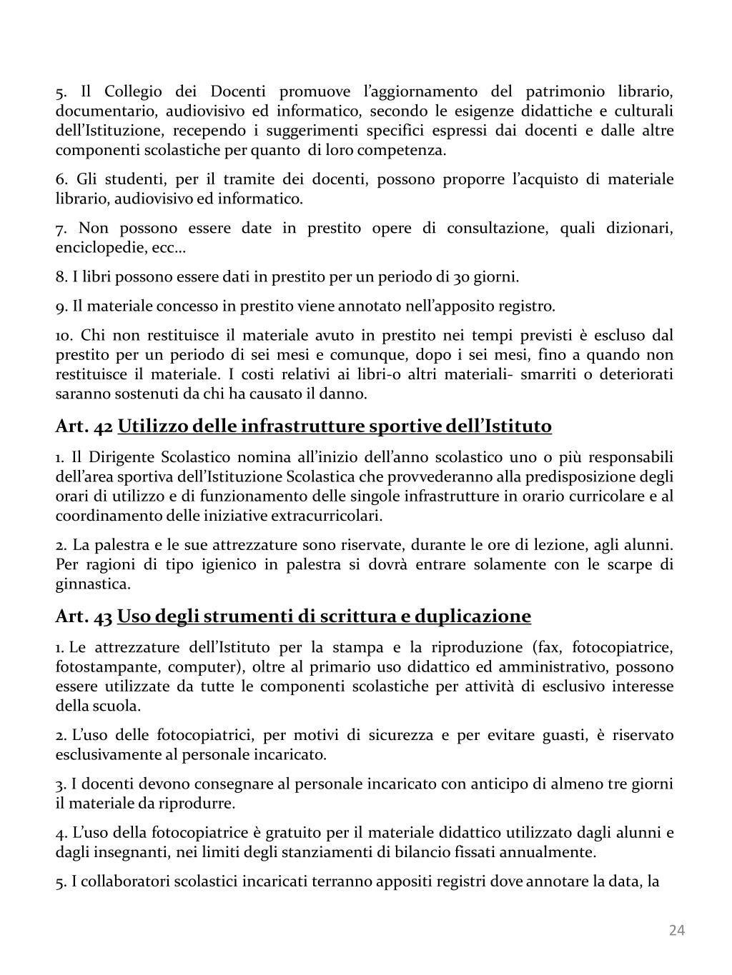 5. Il Collegio dei Docenti promuove l’aggiornamento del patrimonio librario, documentario, audiovisivo ed informatico, secondo le esigenze didattiche e culturali dell’Istituzione, recependo i suggerimenti specifici espressi dai docenti e dalle altre componenti scolastiche per quanto di loro competenza. • 6. Gli studenti, per il tramite dei docenti, possono proporre l’acquisto di materiale librario, audiovisivo ed informatico. • 7. Non possono essere date in prestito opere di consultazione, quali dizionari, enciclopedie, ecc… • 8. I libri possono essere dati in prestito per un periodo di 30 giorni. • 9. Il materiale concesso in prestito viene annotato nell’apposito registro. • 10. Chi non restituisce il materiale avuto in prestito nei tempi previsti è escluso dal prestito per un periodo di sei mesi e comunque, dopo i sei mesi, fino a quando non restituisce il materiale. I costi relativi ai libri-o altri materiali- smarriti o deteriorati saranno sostenuti da chi ha causato il danno. • Art. 42 Utilizzo delle infrastrutture sportive dell’Istituto • 1. Il Dirigente Scolastico nomina all’inizio dell’anno scolastico uno o più responsabili dell’area sportiva dell’Istituzione Scolastica che provvederanno alla predisposizione degli orari di utilizzo e di funzionamento delle singole infrastrutture in orario curricolare e al coordinamento delle iniziative extracurricolari. • 2. La palestra e le sue attrezzature sono riservate, durante le ore di lezione, agli alunni. Per ragioni di tipo igienico in palestra si dovrà entrare solamente con le scarpe di ginnastica. • Art. 43 Uso degli strumenti di scrittura e duplicazione • Le attrezzature dell’Istituto per la stampa e la riproduzione (fax, fotocopiatrice, fotostampante, computer), oltre al primario uso didattico ed amministrativo, possono essere utilizzate da tutte le componenti scolastiche per attività di esclusivo interesse della scuola. • L’uso delle fotocopiatrici, per motivi di sicurezza e per evitare guasti, è riservato esclusivamente al personale incaricato. • I docenti devono consegnare al personale incaricato con anticipo di almeno tre giorni il materiale da riprodurre. • L’uso della fotocopiatrice è gratuito per il materiale didattico utilizzato dagli alunni e dagli insegnanti, nei limiti degli stanziamenti di bilancio fissati annualmente. • I collaboratori scolastici incaricati terranno appositi registri dove annotare la data, la