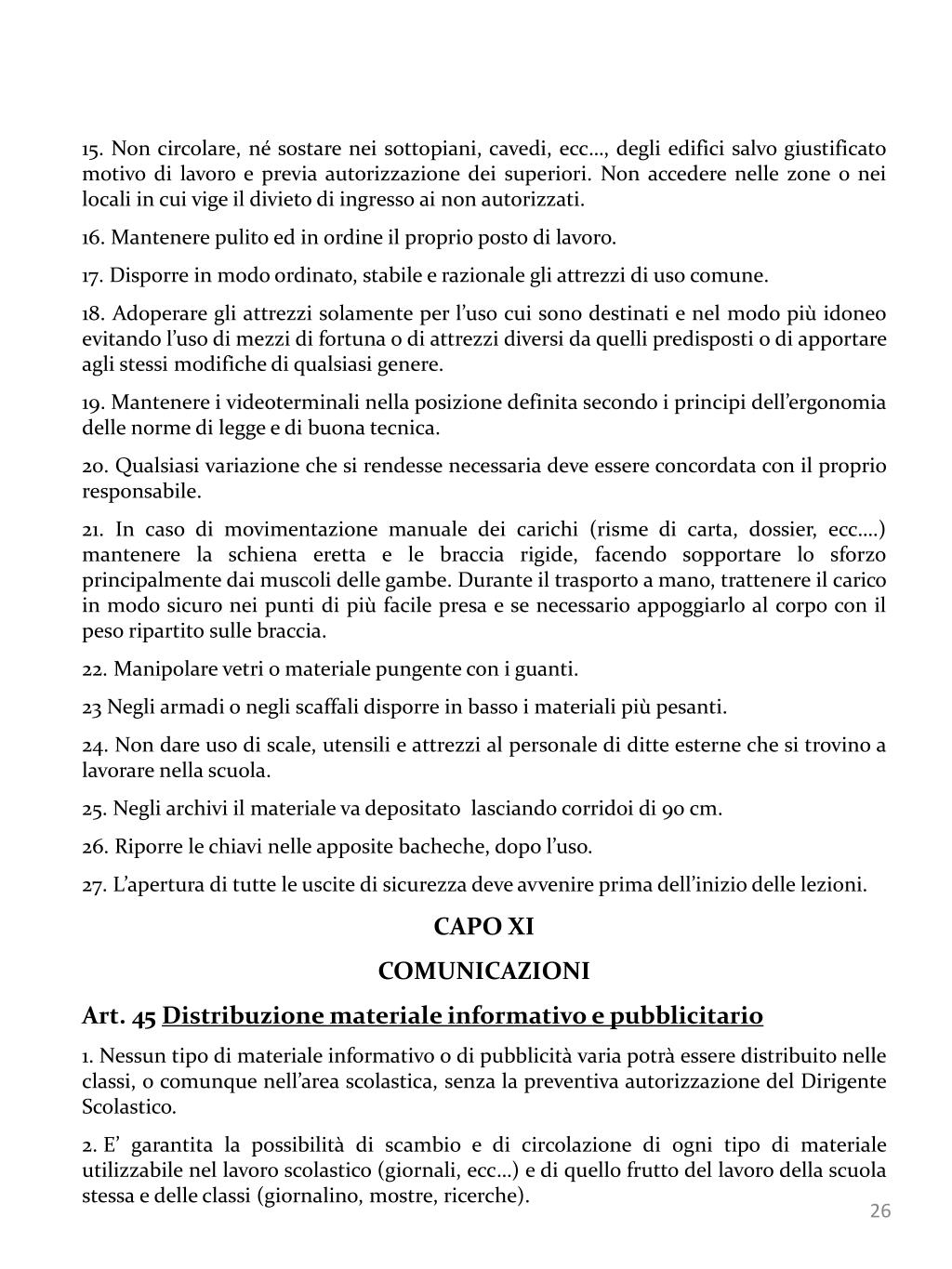 15. Non circolare, né sostare nei sottopiani, cavedi, ecc…, degli edifici salvo giustificato motivo di lavoro e previa autorizzazione dei superiori. Non accedere nelle zone o nei locali in cui vige il divieto di ingresso ai non autorizzati. • 16. Mantenere pulito ed in ordine il proprio posto di lavoro. • 17. Disporre in modo ordinato, stabile e razionale gli attrezzi di uso comune. • 18. Adoperare gli attrezzi solamente per l’uso cui sono destinati e nel modo più idoneo evitando l’uso di mezzi di fortuna o di attrezzi diversi da quelli predisposti o di apportare agli stessi modifiche di qualsiasi genere. • 19. Mantenere i videoterminali nella posizione definita secondo i principi dell’ergonomia delle norme di legge e di buona tecnica. • 20. Qualsiasi variazione che si rendesse necessaria deve essere concordata con il proprio responsabile. • 21. In caso di movimentazione manuale dei carichi (risme di carta, dossier, ecc….) mantenere la schiena eretta e le braccia rigide, facendo sopportare lo sforzo principalmente dai muscoli delle gambe. Durante il trasporto a mano, trattenere il carico in modo sicuro nei punti di più facile presa e se necessario appoggiarlo al corpo con il peso ripartito sulle braccia. • 22. Manipolare vetri o materiale pungente con i guanti. • 23 Negli armadi o negli scaffali disporre in basso i materiali più pesanti. • 24. Non dare uso di scale, utensili e attrezzi al personale di ditte esterne che si trovino a lavorare nella scuola. • 25. Negli archivi il materiale va depositato lasciando corridoi di 90 cm. • 26. Riporre le chiavi nelle apposite bacheche, dopo l’uso. • 27. L’apertura di tutte le uscite di sicurezza deve avvenire prima dell’inizio delle lezioni. • CAPO XI • COMUNICAZIONI • Art. 45 Distribuzione materiale informativo e pubblicitario • Nessun tipo di materiale informativo o di pubblicità varia potrà essere distribuito nelle classi, o comunque nell’area scolastica, senza la preventiva autorizzazione del Dirigente Scolastico. • E’ garantita la possibilità di scambio e di circolazione di ogni tipo di materiale utilizzabile nel lavoro scolastico (giornali, ecc…) e di quello frutto del lavoro della scuola stessa e delle classi (giornalino, mostre, ricerche).