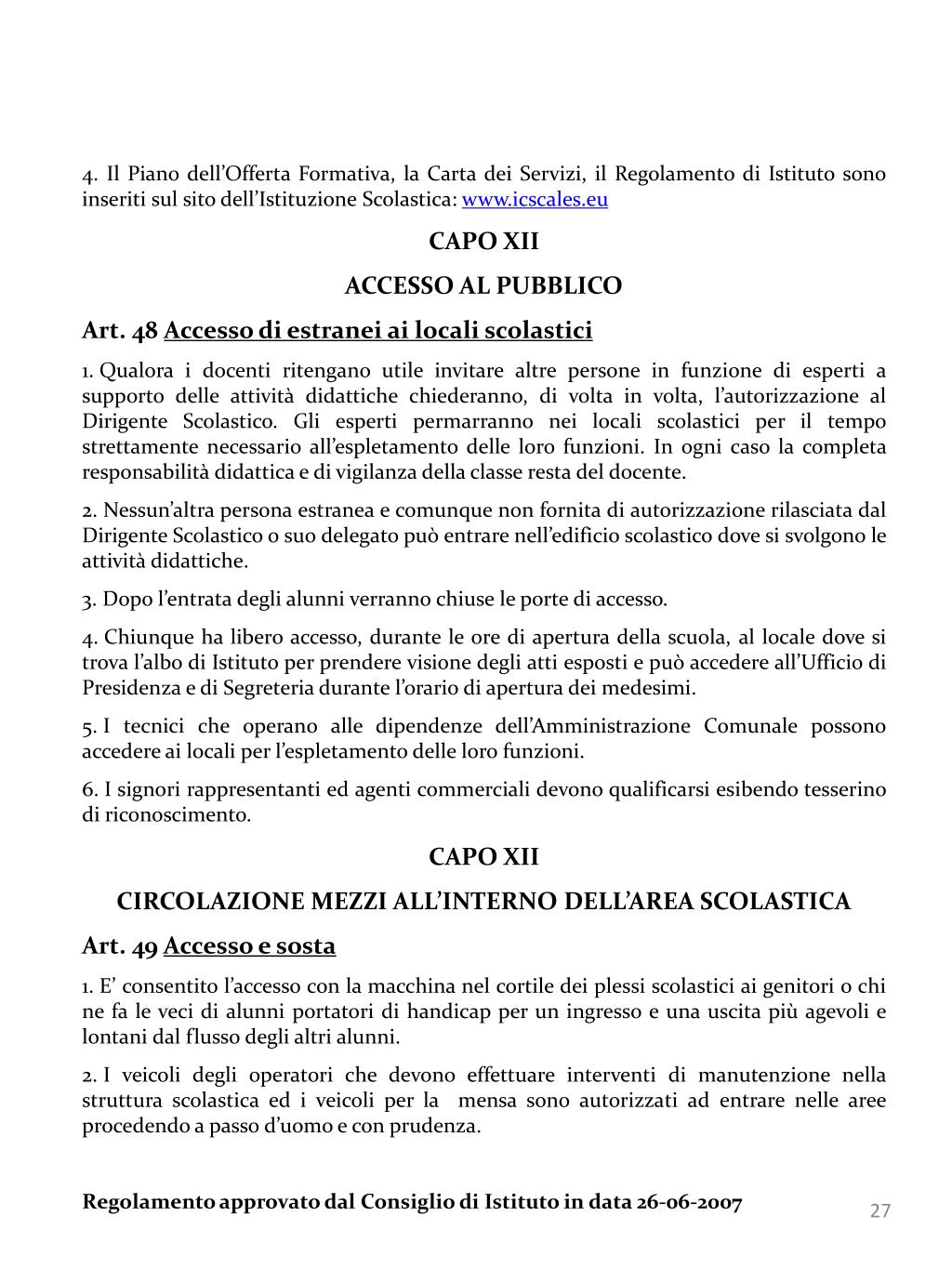 4. Il Piano dell’Offerta Formativa, la Carta dei Servizi, il Regolamento di Istituto sono inseriti sul sito dell’Istituzione Scolastica: www.icscales.eu • CAPO XII • ACCESSO AL PUBBLICO • Art. 48 Accesso di estranei ai locali scolastici • Qualora i docenti ritengano utile invitare altre persone in funzione di esperti a supporto delle attività didattiche chiederanno, di volta in volta, l’autorizzazione al Dirigente Scolastico. Gli esperti permarranno nei locali scolastici per il tempo strettamente necessario all’espletamento delle loro funzioni. In ogni caso la completa responsabilità didattica e di vigilanza della classe resta del docente. • Nessun’altra persona estranea e comunque non fornita di autorizzazione rilasciata dal Dirigente Scolastico o suo delegato può entrare nell’edificio scolastico dove si svolgono le attività didattiche. • Dopo l’entrata degli alunni verranno chiuse le porte di accesso. • Chiunque ha libero accesso, durante le ore di apertura della scuola, al locale dove si trova l’albo di Istituto per prendere visione degli atti esposti e può accedere all’Ufficio di Presidenza e di Segreteria durante l’orario di apertura dei medesimi. • I tecnici che operano alle dipendenze dell’Amministrazione Comunale possono accedere ai locali per l’espletamento delle loro funzioni. • I signori rappresentanti ed agenti commerciali devono qualificarsi esibendo tesserino di riconoscimento. • CAPO XII • CIRCOLAZIONE MEZZI ALL’INTERNO DELL’AREA SCOLASTICA • Art. 49 Accesso e sosta • E’ consentito l’accesso con la macchina nel cortile dei plessi scolastici ai genitori o chi ne fa le veci di alunni portatori di handicap per un ingresso e una uscita più agevoli e lontani dal flusso degli altri alunni. • I veicoli degli operatori che devono effettuare interventi di manutenzione nella struttura scolastica ed i veicoli per la mensa sono autorizzati ad entrare nelle aree procedendo a passo d’uomo e con prudenza. • Regolamento approvato dal Consiglio di Istituto in data 26-06-2007